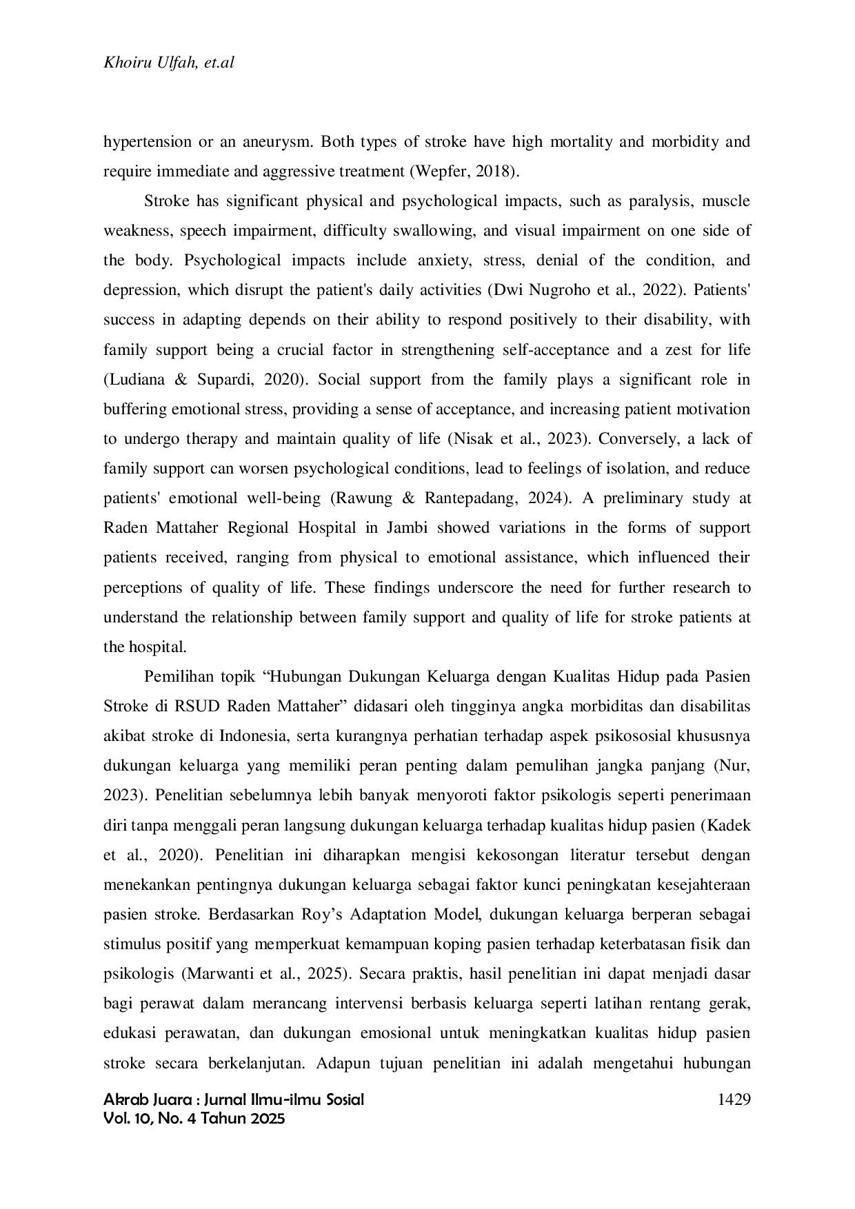 Akrab Juara : Jurnal Ilmu-ilmu SosialAkrab Juara : Jurnal Ilmu-ilmu SosialStroke is a leading non-communicable disease causing disability and death worldwide, resulting in physical impairments and psychological impacts. Family support plays a vital role in providing motivation, emotional stability, and assistance with daily activities, enhancing morale, treatment adherence, and overall quality of life. This analytical observational study with a cross-sectional design involved 90 respondents and utilized the Family Support Questionnaire and the Stroke-Specific Quality of Life (SS-QOL) questionnaire. Statistical analysis revealed a strong and significant correlation between family support and quality of life (r = 0.799; p = 0.000). Enhanced family support significantly contributes to better adaptation and improved well-being among stroke survivors.