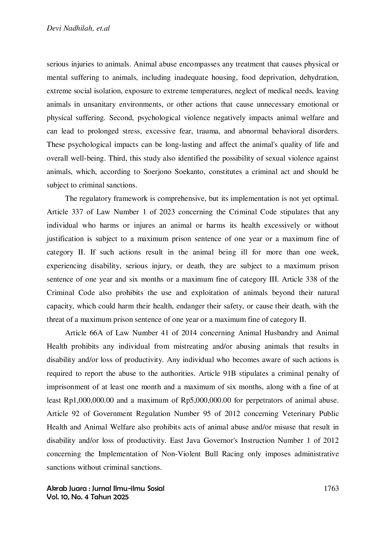Akrab Juara : Jurnal Ilmu-ilmu SosialAkrab Juara : Jurnal Ilmu-ilmu SosialTradisi karapan sapi merupakan warisan budaya masyarakat Madura yang memiliki nilai sosial dan ekonomi tinggi. Namun, dalam pelaksanaannya terjadi tindakan kekerasan terhadap sapi yang merupakan pelanggaran hukum yang masih berlangsung hingga kini. Penelitian ini membahas pertanggungjawaban pidana atas tindakan kekerasan dan penganiayaan hewan dalam karapan sapi untuk mengetahui upaya pemerintah dan bentuk perlindungan terhadap hewan dalam pelaksanaan karapan sapi. Penelitian ini menggunakan metode yuridis normatif dengan pendekatan konseptual serta perundang-undangan untuk menganalisis peraturan hukum yang relevan.Hasil penelitian menunjukkan bahwa penegakan hukum belum terlaksana meskipun telah ada peraturan yang melarang kekerasan terhadap hewan, seperti Instruksi Gubernur Jawa Timur Nomor 1 Tahun 2012 tentang Karapan Sapi Tanpa Kekerasan, Undang-Undang Nomor 41 Tahun 2014, dan Peraturan Pemerintah Nomor 95 Tahun 2012 tentang Kesejahteraan Hewan. Penelitian ini diharapkan dapat meningkatkan kepedulian masyarakat serta mendorong reformasi hukum untuk menjamin perlindungan hewan dari praktik kekerasan dan penganiayaan.