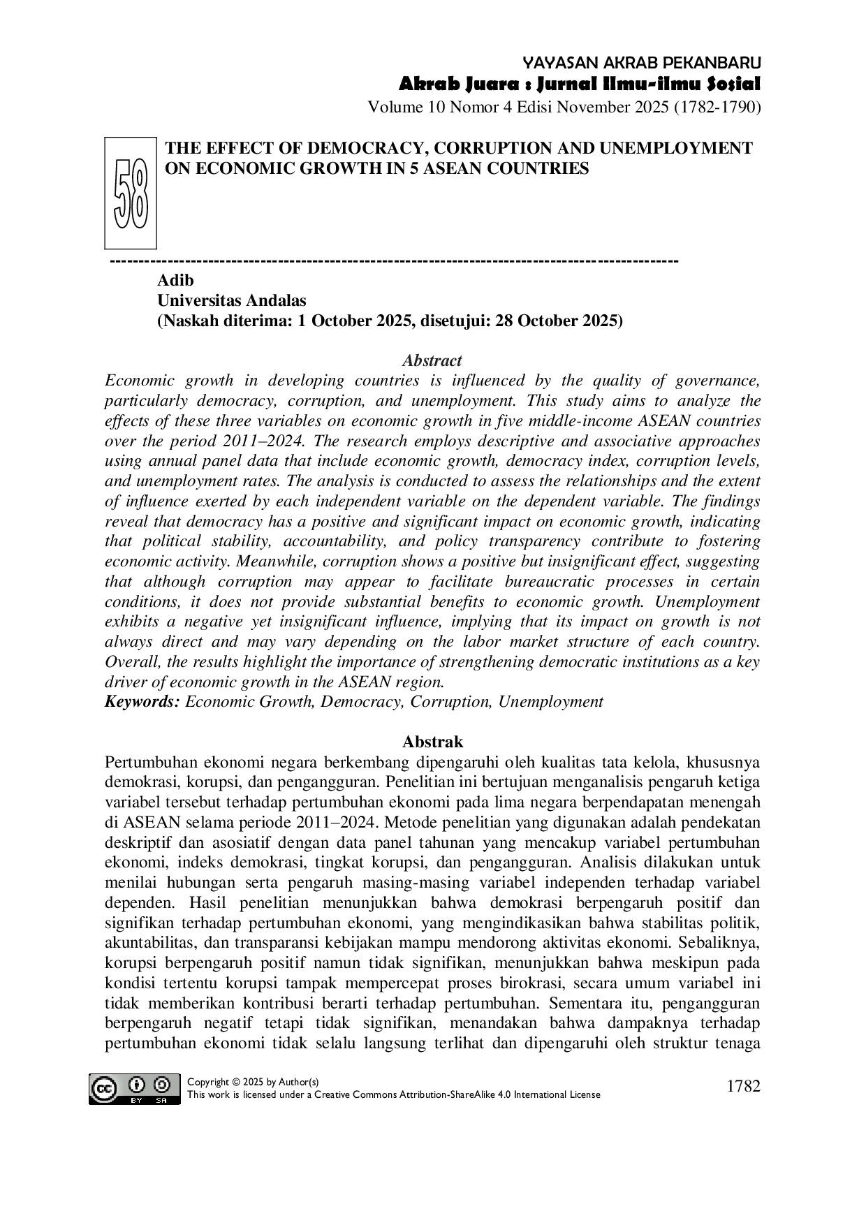 Akrab Juara : Jurnal Ilmu-ilmu SosialAkrab Juara : Jurnal Ilmu-ilmu SosialPertumbuhan ekonomi negara berkembang dipengaruhi oleh kualitas tata kelola, khususnya demokrasi, korupsi, dan pengangguran. Penelitian ini bertujuan menganalisis pengaruh ketiga variabel tersebut terhadap pertumbuhan ekonomi pada lima negara berpendapatan menengah di ASEAN selama periode 2011–2024. Metode penelitian yang digunakan adalah pendekatan deskriptif dan asosiatif dengan data panel tahunan yang mencakup variabel pertumbuhan ekonomi, indeks demokrasi, tingkat korupsi, dan pengangguran. Analisis dilakukan untuk menilai hubungan serta pengaruh masing-masing variabel independen terhadap variabel dependen. Hasil penelitian menunjukkan bahwa demokrasi berpengaruh positif dan signifikan terhadap pertumbuhan ekonomi, yang mengindikasikan bahwa stabilitas politik, akuntabilitas, dan transparansi kebijakan mampu mendorong aktivitas ekonomi. Sebaliknya, korupsi berpengaruh positif namun tidak signifikan, menunjukkan bahwa meskipun pada kondisi tertentu korupsi tampak mempercepat proses birokrasi, secara umum variabel ini tidak memberikan kontribusi berarti terhadap pertumbuhan. Sementara itu, pengangguran berpengaruh negatif tetapi tidak signifikan, menandakan bahwa dampaknya terhadap pertumbuhan ekonomi tidak selalu langsung terlihat dan dipengaruhi oleh struktur tenaga kerja masing-masing negara. Temuan ini menegaskan pentingnya penguatan institusi demokratis sebagai pendorong utama pertumbuhan ekonomi di kawasan ASEAN.