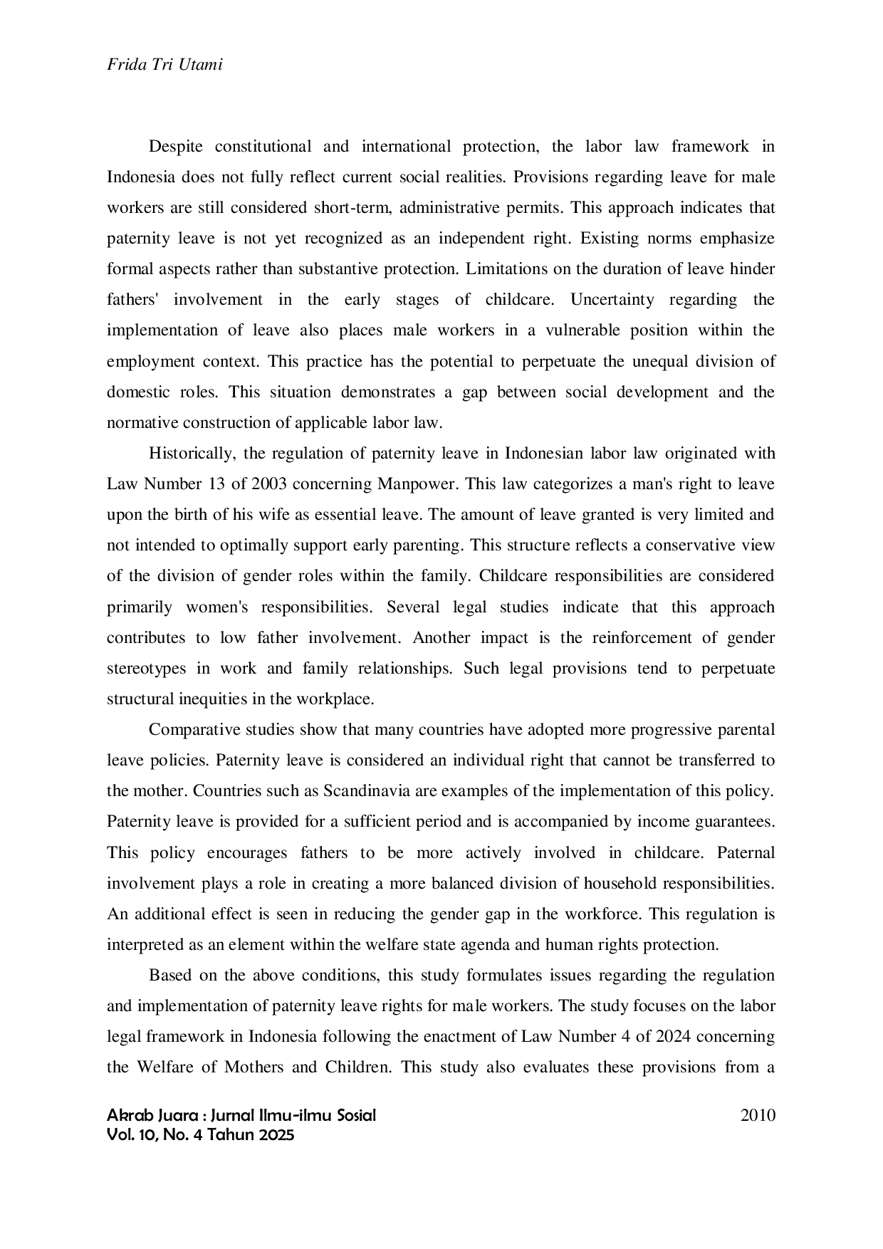 Akrab Juara : Jurnal Ilmu-ilmu SosialAkrab Juara : Jurnal Ilmu-ilmu SosialPerubahan pola relasi kerja dan keluarga dalam masyarakat modern memunculkan kebutuhan lebih responsif terhadap peran ayah dalam pengaturan ketenagakerjaan yang pengasuhan anak. Dalam praktik hukum ketenagakerjaan, hak paternity leave bagi pekerja laki-laki masih menunjukkan perlindungan yang terbatas dan belum sepenuhnya mencerminkan prinsip hak asasi manusia, khususnya kesetaraan gender dan perlindungan kehidupan keluarga.