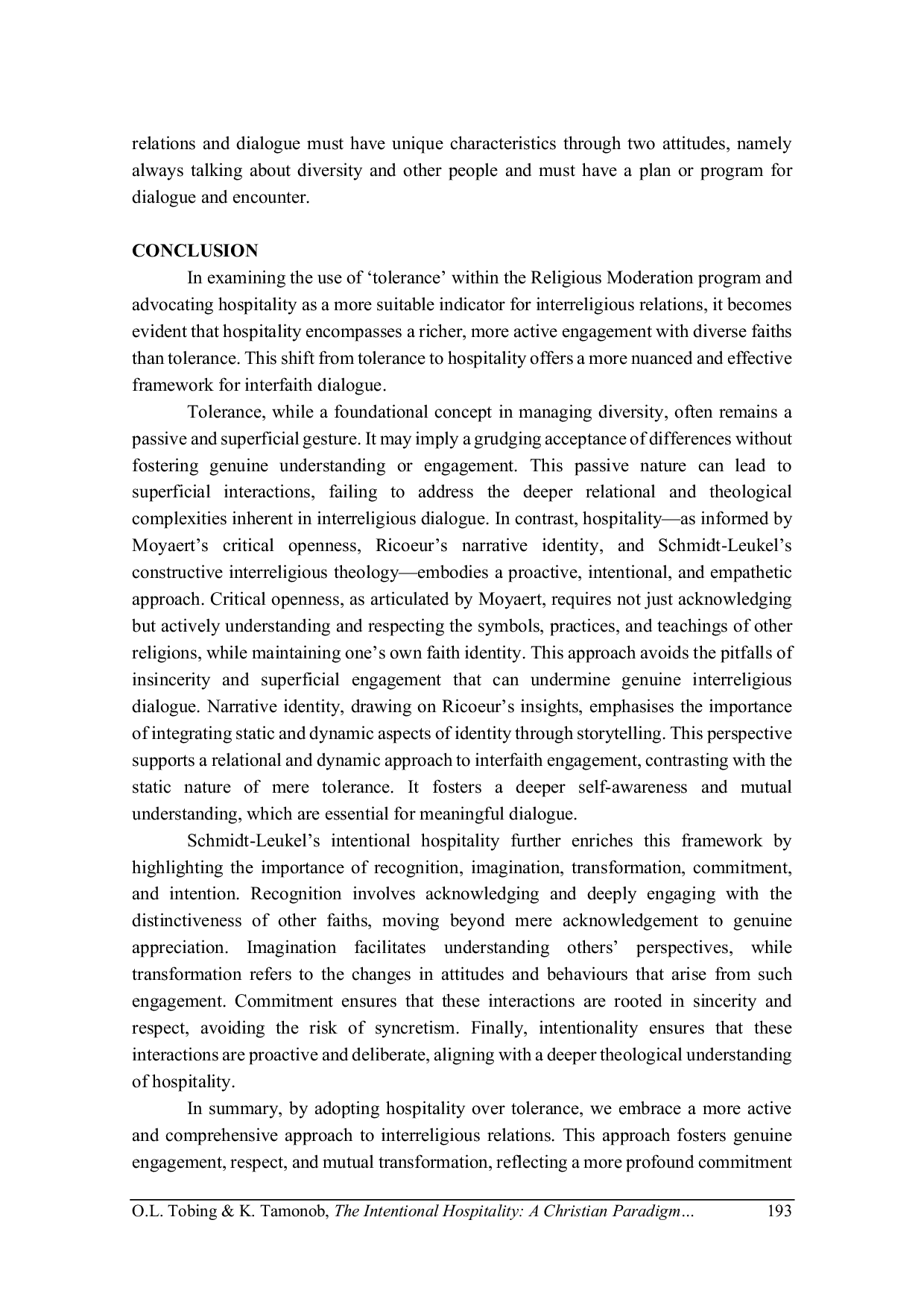 Dalam memeriksa penggunaan toleransi dalam program Moderasi Beragama dan mendukung keramahtamahan sebagai indikator yang lebih sesuai untuk hubungan antaragama, menjadi jelas bahwa keramahtamahan mencakup keterlibatan yang lebih kaya dan aktif dengan berbagai agama daripada toleransi.Peralihan dari toleransi ke keramahtamahan menawarkan kerangka yang lebih nuansa dan efektif untuk dialog antaragama.Toleransi, meskipun merupakan konsep dasar dalam mengelola keragaman, sering tetap menjadi gestur pasif dan dangkal.Hal ini mungkin hanya menyiratkan penerimaan yang enggan terhadap perbedaan tanpa mendorong pemahaman atau keterlibatan yang tulus.Sifat pasif ini dapat menyebabkan interaksi yang dangkal, gagal mengatasi kompleksitas relasional dan teologis yang lebih dalam yang melekat dalam dialog antaragama.Sebaliknya, keramahtamahan - seperti yang diinformasikan oleh keramahtamahan kritis Moyaert, identitas naratif Ricoeur, dan keramahtamahan interagama Schmidt-Leukel - mewujudkan pendekatan proaktif, disengaja, dan empati.Keramahtamahan kritis, seperti yang diartikulasikan oleh Moyaert, tidak hanya mengakui tetapi juga memahami dan menghormati simbol, praktik, dan ajaran agama lain, sambil mempertahankan identitas iman sendiri.Pendekatan ini menghindari perangkap ketidakjujuran dan keterlibatan dangkal yang dapat merusak dialog antaragama yang tulus.Identitas naratif, berdasarkan wawasan Ricoeur, menekankan pentingnya mengintegrasikan aspek statis dan dinamis identitas melalui cerita.Perspektif ini mendukung pendekatan relasional dan dinamis terhadap keterlibatan antaragama, berlawanan dengan sifat statis toleransi semata.Hal ini mendorong kesadaran diri yang lebih dalam dan pemahaman bersama, yang esensial untuk dialog yang bermakna.Keramahtamahan disengaja Schmidt-Leukel lebih memperkaya kerangka ini dengan menekankan pentingnya pengakuan, imajinasi, transformasi, komitmen, dan niat.Pengakuan melibatkan mengakui dan terlibat secara mendalam dengan keunikan agama lain, melampaui pengakuan semata menuju apresiasi yang tulus.