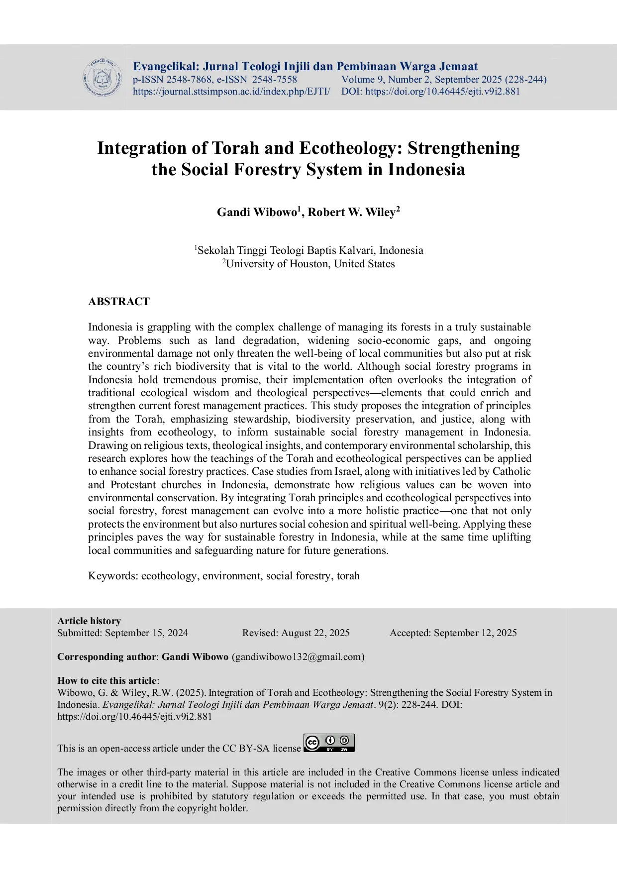 Evangelikal: Jurnal Teologi InjiliEvangelikal: Jurnal Teologi InjiliIndonesia is grappling with the complex challenge of managing its forests in a truly sustainable way. Problems such as land degradation, widening socio-economic gaps, and ongoing environmental damage not only threaten the well-being of local communities but also put at risk the countrys rich biodiversity that is vital to the world. Although social forestry programs in Indonesia hold tremendous promise, their implementation often overlooks the integration of traditional ecological wisdom and theological perspectives—elements that could enrich and strengthen current forest management practices. This study proposes the integration of principles from the Torah, emphasizing stewardship, biodiversity preservation, and justice, along with insights from ecotheology, to inform sustainable social forestry management in Indonesia. Drawing on religious texts, theological insights, and contemporary environmental scholarship, this research explores how the teachings of the Torah and ecotheological perspectives can be applied to enhance social forestry practices. Case studies from Israel, along with initiatives led by Catholic and Protestant churches in Indonesia, demonstrate how religious values can be woven into environmental conservation. By integrating Torah principles and ecotheological perspectives into social forestry, forest management can evolve into a more holistic practice—one that not only protects the environment but also nurtures social cohesion and spiritual well-being. Applying these principles paves the way for sustainable forestry in Indonesia, while at the same time uplifting local communities and safeguarding nature for future generations.
