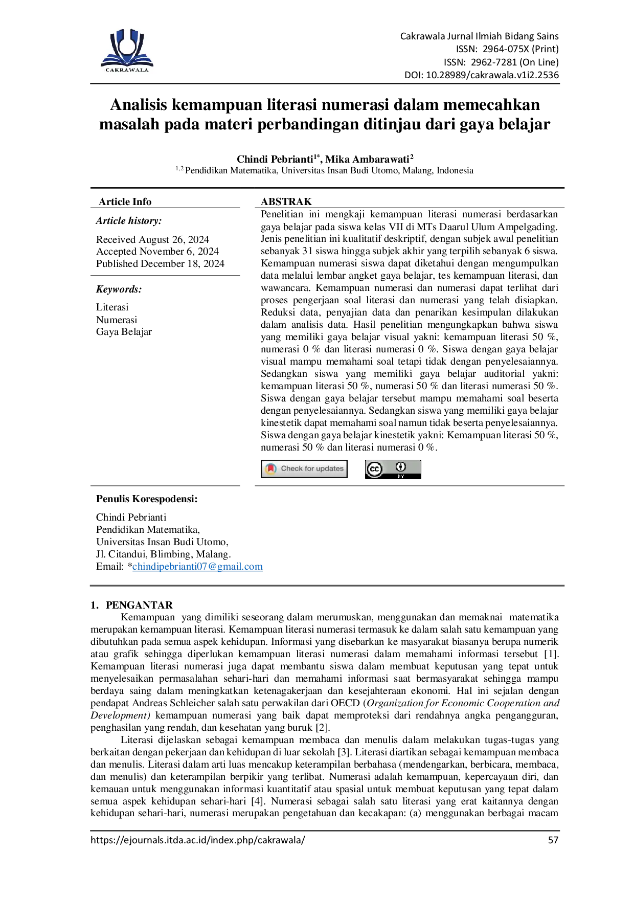 CakrawalaCakrawalaPenelitian ini mengkaji kemampuan literasi numerasi berdasarkan gaya belajar pada siswa kelas VII di MTs Daarul Ulum Ampelgading. Jenis penelitian ini kualitatif deskriptif, dengan subjek awal penelitian sebanyak 31 siswa hingga subjek akhir yang terpilih sebanyak 6 siswa. Kemampuan numerasi siswa dapat diketahui dengan mengumpulkan data melalui lembar angket gaya belajar, tes kemampuan literasi, dan wawancara. Hasil penelitian mengungkapkan bahwa siswa yang memiliki gaya belajar visual mempunyai kemampuan literasi 50 %, numerasi 0 %, dan literasi numerasi 0 %. Siswa dengan gaya belajar auditorial mempunyai kemampuan literasi 50 %, numerasi 50 %, dan literasi numerasi 50 %. Siswa yang memiliki gaya belajar kinestetik memiliki kemampuan literasi 50 %, numerasi 50 %, dan literasi numerasi 0 %.