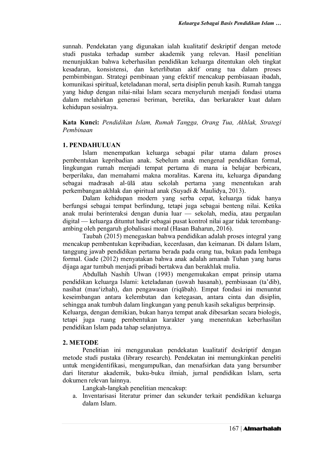 Almarhalah: Jurnal Pendidikan IslamAlmarhalah: Jurnal Pendidikan IslamDalam pandangan Islam, keluarga menempati posisi fundamental sebagai lembaga pendidikan pertama yang menanamkan nilai moral, spiritual, serta sosial kepada anak. Orang tua bertanggung jawab penuh membentuk kepribadian Islami melalui teladan, kasih sayang, dan kebiasaan beribadah. Penelitian ini bertujuan menelaah peran orang tua dalam pendidikan Islam berbasis rumah tangga serta merumuskan strategi pembinaan akhlak anak dengan berlandaskan Al-Quran dan sunnah. Pendekatan yang digunakan ialah kualitatif deskriptif dengan metode studi pustaka terhadap sumber akademik yang relevan. Hasil penelitian menunjukkan bahwa keberhasilan pendidikan keluarga ditentukan oleh tingkat kesadaran, konsistensi, dan keterlibatan aktif orang tua dalam proses pembimbingan. Strategi pembinaan yang efektif mencakup pembiasaan ibadah, komunikasi spiritual, keteladanan moral, serta disiplin penuh kasih. Rumah tangga yang hidup dengan nilai-nilai Islam secara menyeluruh menjadi fondasi utama dalam melahirkan generasi beriman, beretika, dan berkarakter kuat dalam kehidupan sosialnya.