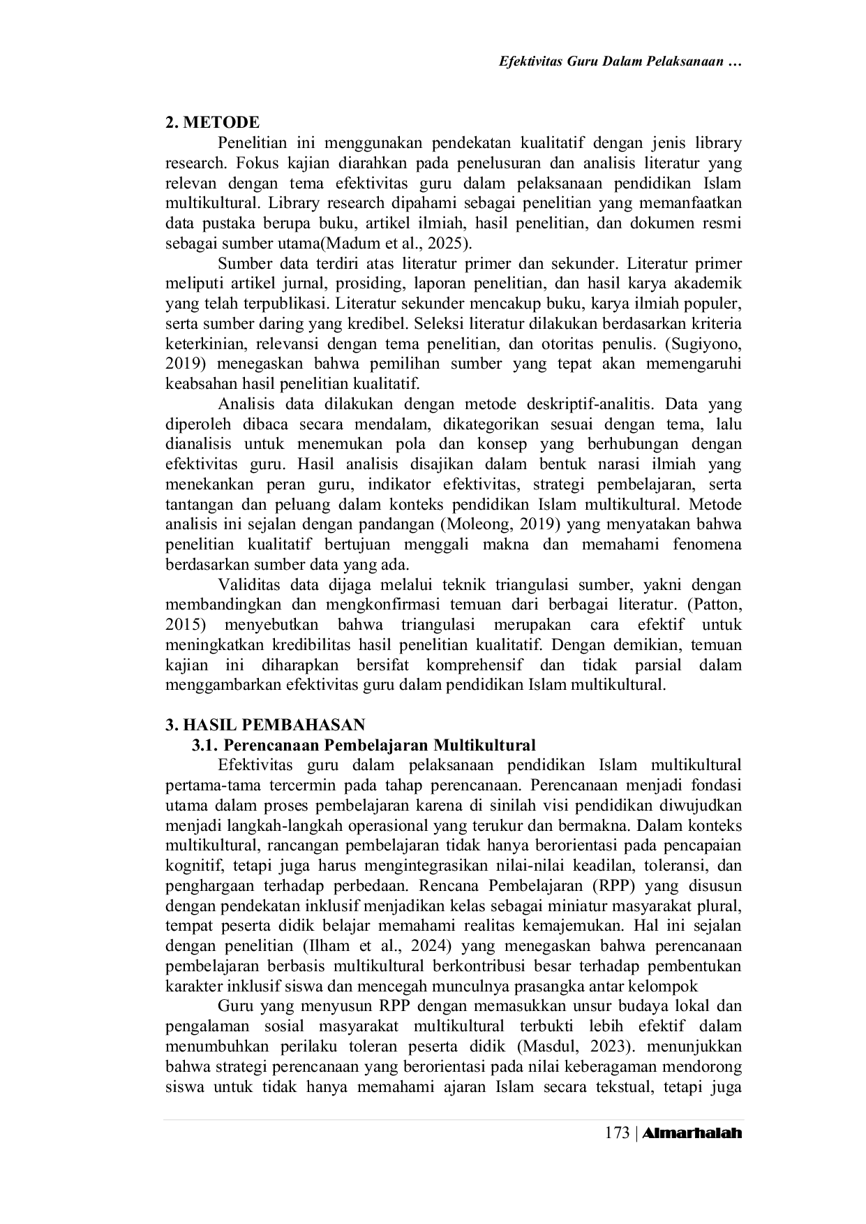 Efektivitas guru dalam pendidikan Islam multikultural mencakup perencanaan strategis, pelaksanaan aktif, evaluasi menyeluruh, dan keteladanan moral.Guru yang efektif adalah mereka yang mampu menanamkan nilai-nilai kemanusiaan universal seperti toleransi, keadilan, dan penghargaan terhadap perbedaan.Pendidikan Islam multikultural berfungsi memperkuat kohesi sosial dan memperkuat identitas keagamaan yang moderat.