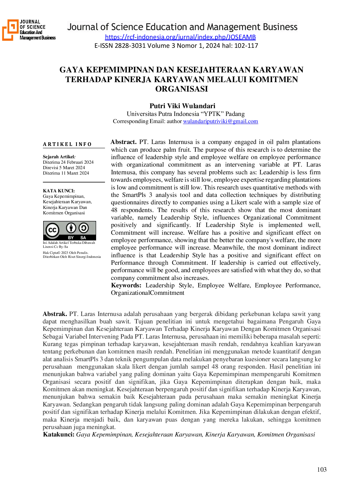 Journal of Science Education and Management BusinessJournal of Science Education and Management BusinessPenelitian ini bertujuan untuk mengetahui pengaruh pada PT. Laras Internusa. Metode penelitian menggunakan metode kuantitatif dengan alat analisis SmartPLS 3. Hasil penelitian menunjukkan bahwa gaya kepemimpinan berpengaruh positif dan signifikan terhadap komitmen organisasi, kesejahteraan karyawan berpengaruh positif dan signifikan terhadap komitmen organisasi, dan komitmen organisasi berpengaruh positif dan signifikan terhadap kinerja karyawan.