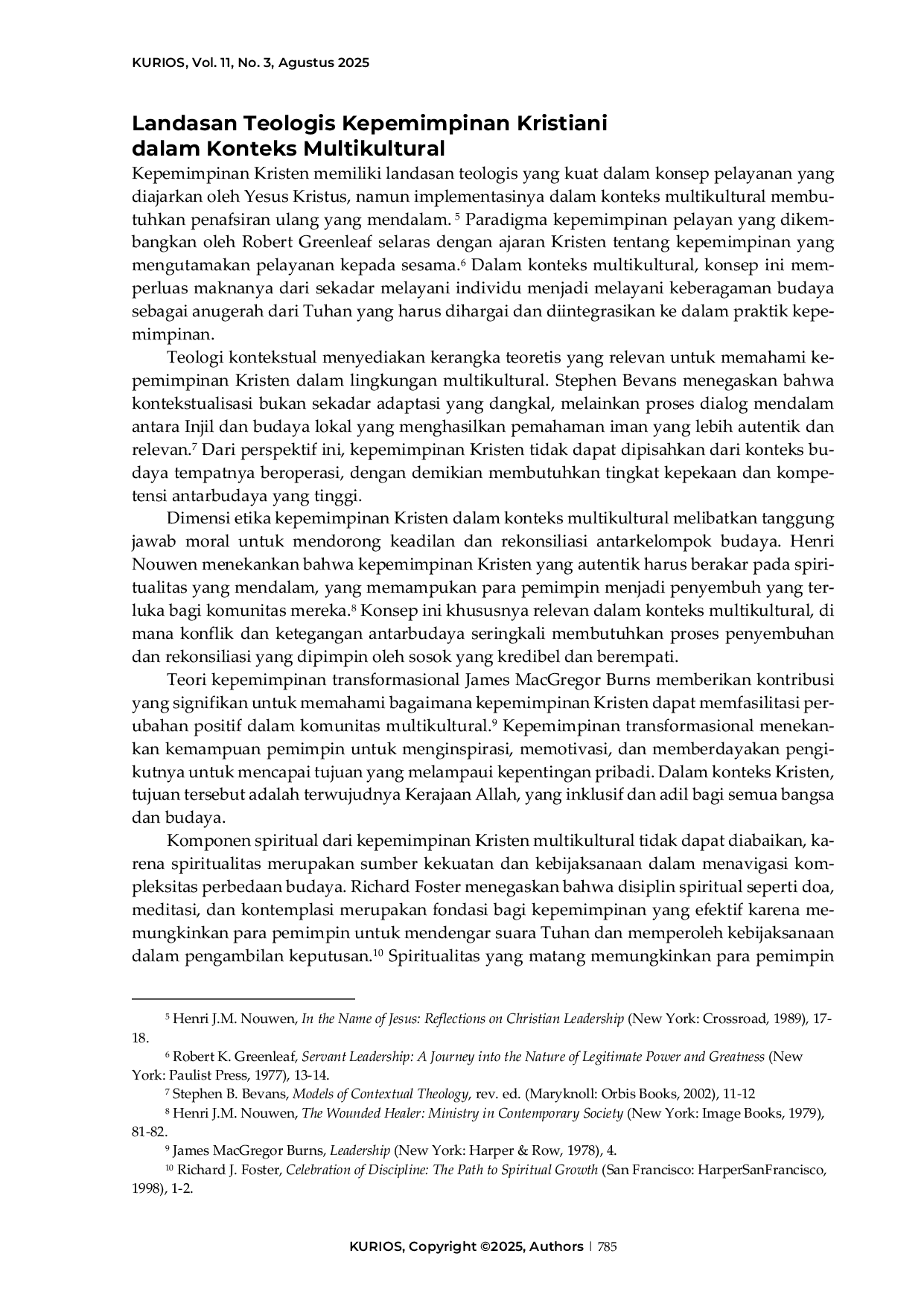 KURIOSKURIOSEra posmodern menghadirkan tantangan kompleks bagi kepemimpinan Kristiani dalam membangun komunitas yang resilien di tengah fragmentasi sosial dan pluralitas budaya. Penelitian ini menganalisis transformasi kepemimpinan Kristiani melalui dialog antarbudaya sebagai strategi membangun ketahanan komunitas. Menggunakan metode analisis literatur dengan pendekatan hermeneutik-fenomenologis, data dikumpulkan melalui studi komprehensif terhadap sumber-sumber teologi, kepemimpinan, dan antropologi budaya. Penelitian menghasilkan model kepemimpinan responsif budaya yang mengintegrasikan nilai-nilai Kristiani dengan sensitivitas antarbudaya. Temuan menunjukkan bahwa dialog antarbudaya mentransformasi paradigma kepemimpinan dari pendekatan monokultur menuju inklusivitas yang autentik. Strategi ketahanan komunitas dikembangkan melalui tujuh dimensi: kapasitas adaptif, kohesi sosial, pemberdayaan anggota, resiliensi ekonomi, preservasi budaya, pembentukan jaringan, dan kesiapsiagaan krisis. Kontribusi penelitian adalah kerangka teoretis yang mensinergikan teologi kontekstual dengan kepemimpinan transformatif untuk menghadapi realitas masyarakat multikultural.