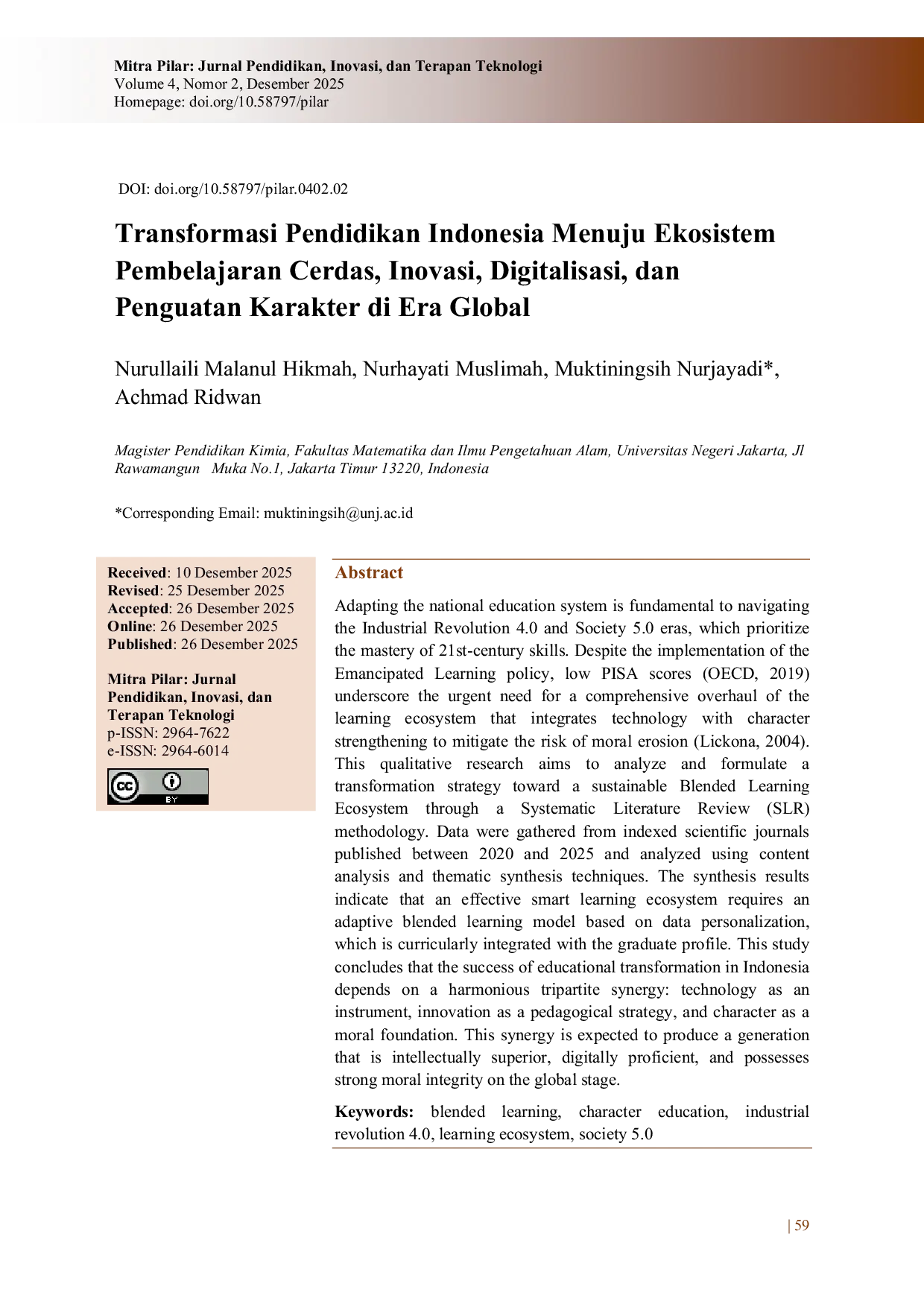 - Transformasi Pendidikan Indonesia Menuju Ekosistem Pembelajaran Cerdas, Inovasi, Digitalisasi, dan Penguatan... doi.org/10.58797/pilar.0402.02Transformasi Pendidikan Indonesia Menuju Ekosistem Pembelajaran Cerdas Inovasi Digitalisasi dan Penguatan doi 10 58797 pilar 0402 02