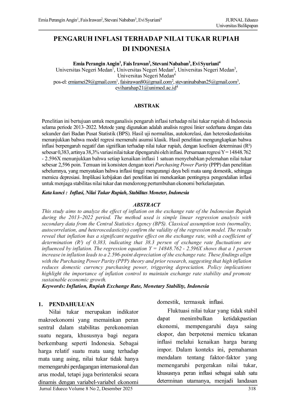 Jurnal EduecoJurnal EduecoPenelitian ini bertujuan untuk menganalisis selama periode 2013–2022. Metode yang digunakan adalah analisis regresi linier sederhana dengan data sekunder dari Badan Pusat Statistik (BPS). Hasil uji normalitas, autokorelasi, dan heteroskedastisitas menunjukkan bahwa model regresi memenuhi asumsi klasik. Hasil penelitian mengungkapkan bahwa inflasi berpengaruh negatif dan signifikan terhadap nilai tukar rupiah, dengan koefisien determinasi (R²) sebesar 0,383, artinya 38,3% variasi nilai tukar dipengaruhi oleh inflasi. Persamaan regresi Y = 14848.762 - 2.596X menunjukkan bahwa setiap kenaikan inflasi 1 satuan menyebabkan pelemahan nilai tukar sebesar 2,596 poin. Temuan ini konsisten dengan teori Purchasing Power Parity (PPP) dan penelitian sebelumnya, yang menyatakan bahwa inflasi tinggi mengurangi daya beli mata uang domestik, sehingga memicu depresiasi. Implikasi kebijakan dari penelitian ini menekankan pentingnya pengendalian inflasi untuk menjaga stabilitas nilai tukar dan mendorong pertumbuhan ekonomi berkelanjutan.