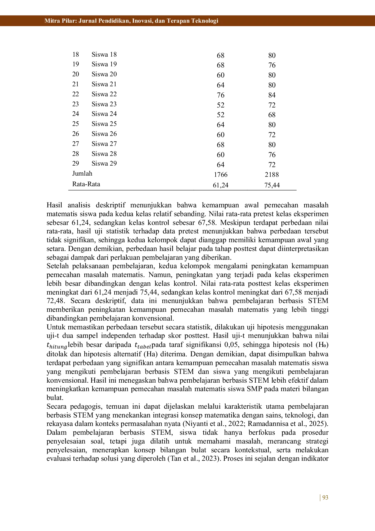Pembelajaran berbasis STEM lebih efektif dalam meningkatkan kemampuan pemecahan masalah matematis siswa SMP pada materi bilangan bulat dibandingkan dengan pembelajaran konvensional.Pembelajaran berbasis STEM dapat menjadi alternatif strategis dalam mendukung pencapaian tujuan pembelajaran matematika yang selaras dengan tuntutan Kurikulum Merdeka.