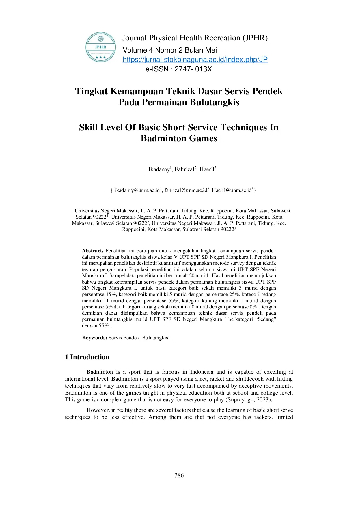 Journal Physical Health Recreation (JPHR)Journal Physical Health Recreation (JPHR)Penelitian ini bertujuan untuk mengetahui tingkat kemampuan servis pendek dalam permainan bulutangkis siswa kelas V UPT SPF SD Negeri Mangkura I. Penelitian ini merupakan penelitian deskriptif kuantitatif menggunakan metode survey dengan teknik tes dan pengukuran. Populasi penelitian ini adalah seluruh siswa di UPT SPF Negeri Mangkura I. Sampel data penelitian ini berjumlah 20 murid. Hasil penelitian menunjukkan bahwa tingkat keterampilan servis pendek dalam permainan bulutangkis siswa UPT SPF SD Negeri Mangkura I, untuk hasil kategori baik sekali memiliki 3 murid dengan persentase 15%, kategori baik memiliki 5 murid dengan persentase 25%, kategori sedang memiliki 11 murid dengan persentase 55%, kategori kurang memiliki 1 murid dengan persentase 5% dan kategori kurang sekali memiliki 0 murid dengan persentase 0%. Dengan demikian dapat disimpulkan bahwa kemampuan teknik dasar servis pendek pada permainan bulutangkis murid UPT SPF SD Negeri Mangkura I berkategori “Sedang dengan 55%.