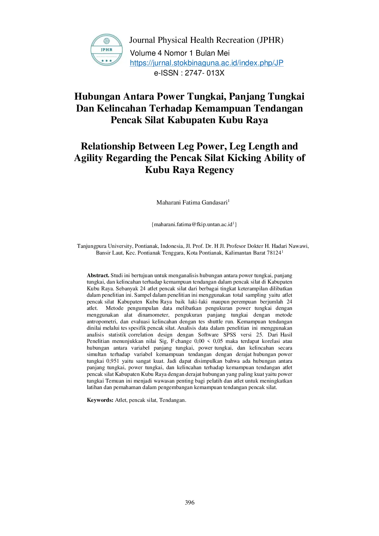 Journal Physical Health Recreation (JPHR)Journal Physical Health Recreation (JPHR)Studi ini bertujuan untuk menganalisis hubungan antara power tungkai, panjang tungkai, dan kelincahan terhadap kemampuan tendangan dalam pencak silat di Kabupaten Kubu Raya. Sebanyak 24 atlet pencak silat dari berbagai tingkat keterampilan dilibatkan dalam penelitian ini. Sampel dalam penelitian ini menggunakan total sampling yaitu atlet pencak silat Kabupaten Kubu Raya baik laki-laki maupun perempuan berjumlah 24 atlet. Metode pengumpulan data melibatkan pengukuran power tungkai dengan menggunakan alat dinamometer, pengukuran panjang tungkai dengan metode antropometri, dan evaluasi kelincahan dengan tes shuttle run. Kemampuan tendangan dinilai melalui tes spesifik pencak silat. Analisis data dalam penelitian ini menggunakan analisis statistik correlation design dengan Software SPSS versi 25. Dari Hasil Penelitian menunjukkan nilai Sig, F change 0,00 < 0,05 maka terdapat korelasi atau hubungan antara variabel panjang tungkai, power tungkai, dan kelincahan secara simultan terhadap variabel kemampuan tendangan dengan derajat hubungan power tungkai 0,951 yaitu sangat kuat. Jadi dapat disimpulkan bahwa ada hubungan antara panjang tungkai, power tungkai, dan kelincahan terhadap kemampuan tendangan atlet pencak silat Kabupaten Kubu Raya dengan derajat hubungan yang paling kuat yaitu power tungkai. Temuan ini menjadi wawasan penting bagi pelatih dan atlet untuk meningkatkan latihan dan pemahaman dalam pengembangan kemampuan tendangan pencak silat.