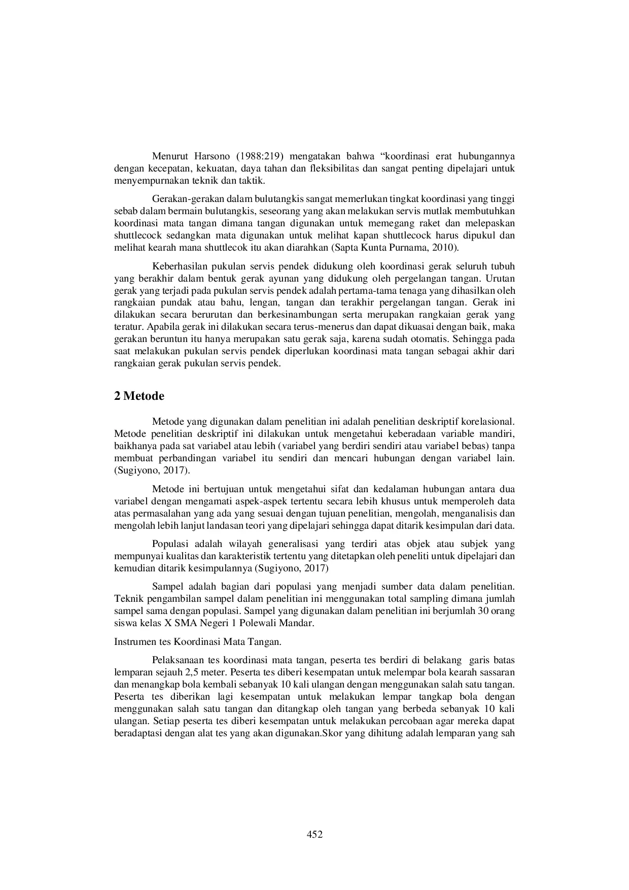 Koordinasi mata-tangan memiliki kontribusi dan pengaruh yang signifikan terhadap pukulan servis pendek siswa kelas X SMA Negeri 1 Polewali Mandar.Koordinasi yang baik antara mata dan tangan sangat penting dalam servis pendek bulutangkis.Mata memandu pemain untuk melacak shuttlecock dengan akurat, sementara tangan merespons instruksi visual yang diberikan oleh mata untuk menggerakkan raket dengan tepat.Pemahaman tentang pentingnya koordinasi mata dan tangan dalam servis pendek bulutangkis serta faktor-faktor yang mempengaruhinya, dapat membantu pemain mengembangkan keterampilan mereka dan meningkatkan kinerja dalam permainan.