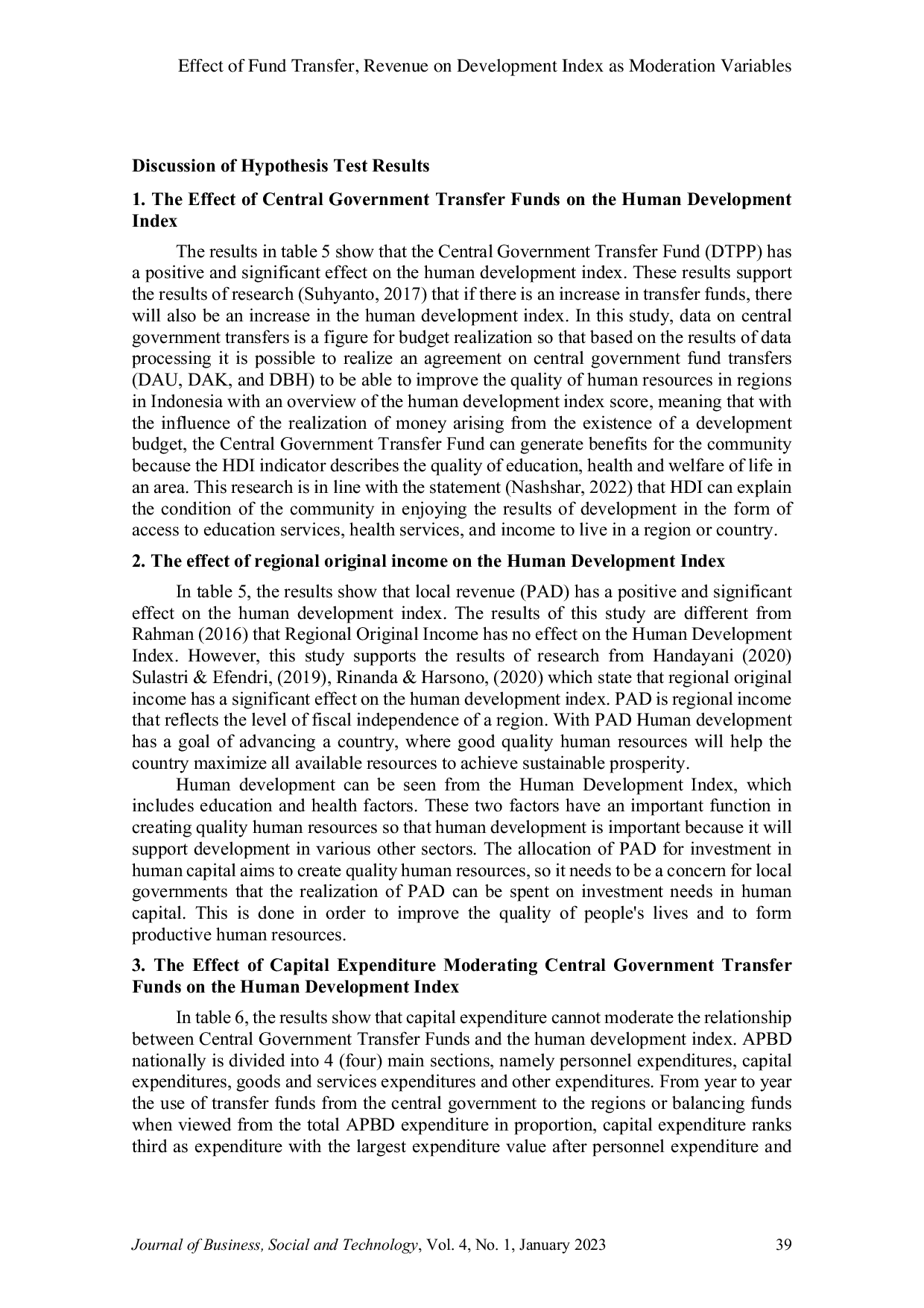 JBTJBTPenelitian ini menguji secara kuantitatif bagaimana pengaruh uang yang berasal dari kegiatan pembangunan, yaitu Dana Transfer Pemerintah Pusat dan Pendapatan Asli Daerah, dapat menghasilkan manfaat atau apakah realisasi anggaran yang dihabiskan oleh pemerintah daerah, yaitu Belanja Modal, dapat menghasilkan nilai atau manfaat tertentu bagi masyarakat, sehingga dalam penelitian ini dapat digambarkan melalui instrumen Indeks Pembangunan Manusia. Pengambilan sampel dalam penelitian ini menggunakan teknik purposive sampling. Data yang digunakan dalam penelitian ini adalah data sekunder yang diperoleh dari Badan Pusat Statistik dan Direktorat Jenderal Keuangan Daerah. Metode penelitian yang digunakan adalah regresi data panel dengan Model Efek Tetap (FEM), di mana data yang dikumpulkan adalah data cross-sectional, yaitu 414 kabupaten/kota di Indonesia untuk periode 2012 hingga 2020 yang merupakan data time series. Hasil yang diperoleh menunjukkan bahwa: (1) DTPP memiliki pengaruh positif dan signifikan terhadap HDI; (2) PAD memiliki pengaruh positif dan signifikan terhadap HDI; (3) Melalui mediasi belanja modal, DTPP memiliki pengaruh negatif dan signifikan terhadap HDI; dan (4) Melalui mediasi belanja modal, PAD memiliki pengaruh positif dan signifikan terhadap HDI.