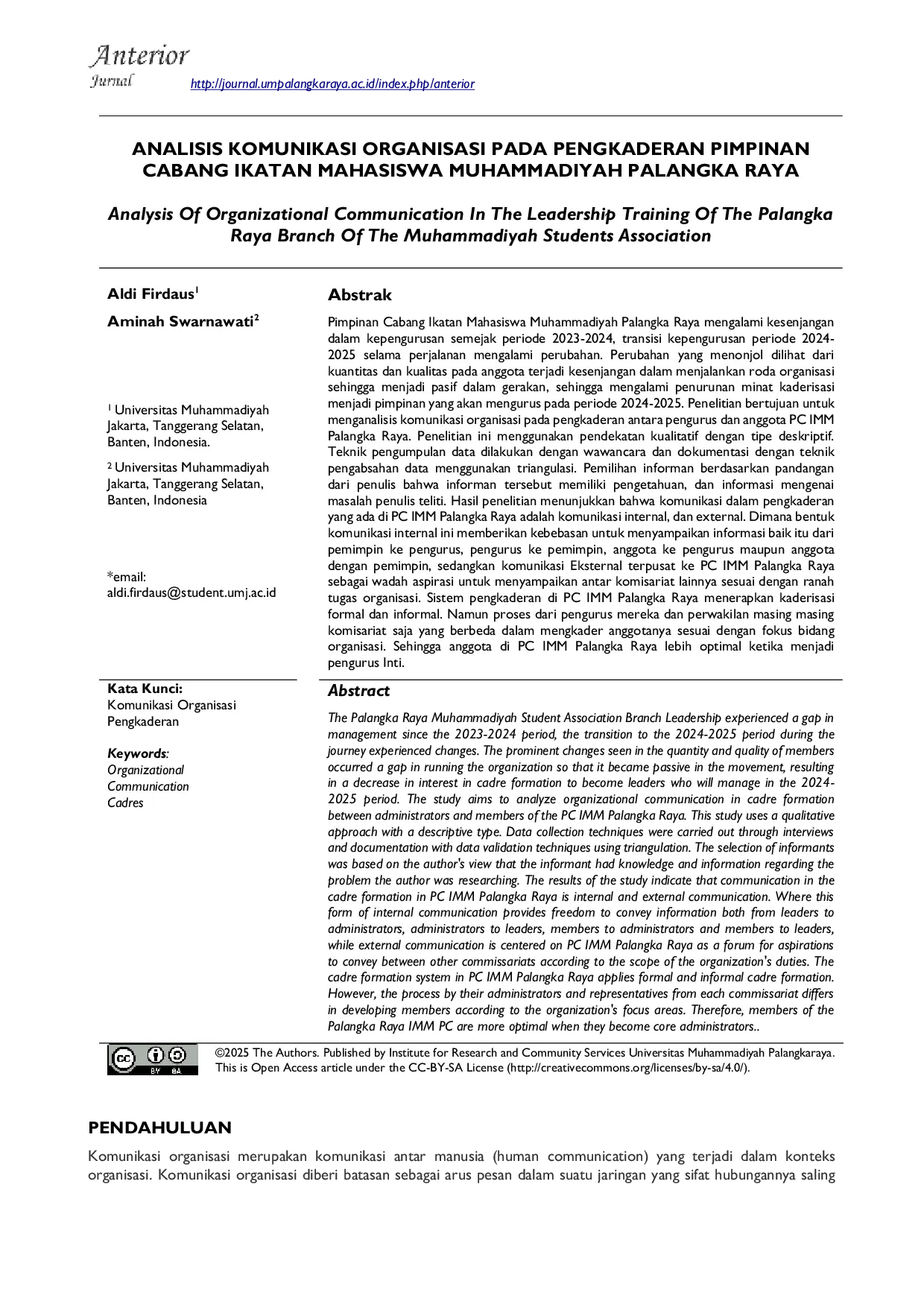 Anterior JurnalAnterior JurnalPimpinan Cabang Ikatan Mahasiswa Muhammadiyah Palangka Raya mengalami kesenjangan dalam kepengurusan sejak periode 2023-2024 hingga transisi ke periode 2024-2025. Perubahan yang terjadi pada kuantitas dan kualitas anggota menyebabkan penurunan minat kaderisasi untuk menjadi pemimpin pada periode berikutnya. Penelitian ini bertujuan untuk menganalisis komunikasi organisasi dalam proses pengkaderan antara pengurus dan anggota PC IMM Palangka Raya. Hasil penelitian menunjukkan bahwa komunikasi dalam pengkaderan di PC IMM Palangka Raya terdiri dari komunikasi internal dan eksternal. Komunikasi internal memberikan kebebasan untuk menyampaikan informasi antara pemimpin, pengurus, dan anggota, sedangkan komunikasi eksternal terpusat pada PC IMM Palangka Raya sebagai wadah aspirasi untuk berkomunikasi dengan komisariat lainnya sesuai dengan tugas organisasi. Sistem pengkaderan di PC IMM Palangka Raya menerapkan kaderisasi formal dan informal, dengan proses yang berbeda antara pengurus dan perwakilan komisariat masing-masing. Penelitian ini menggunakan pendekatan kualitatif dengan tipe deskriptif, dengan teknik pengumpulan data melalui wawancara dan dokumentasi, serta teknik pengabsahan data menggunakan triangulasi.