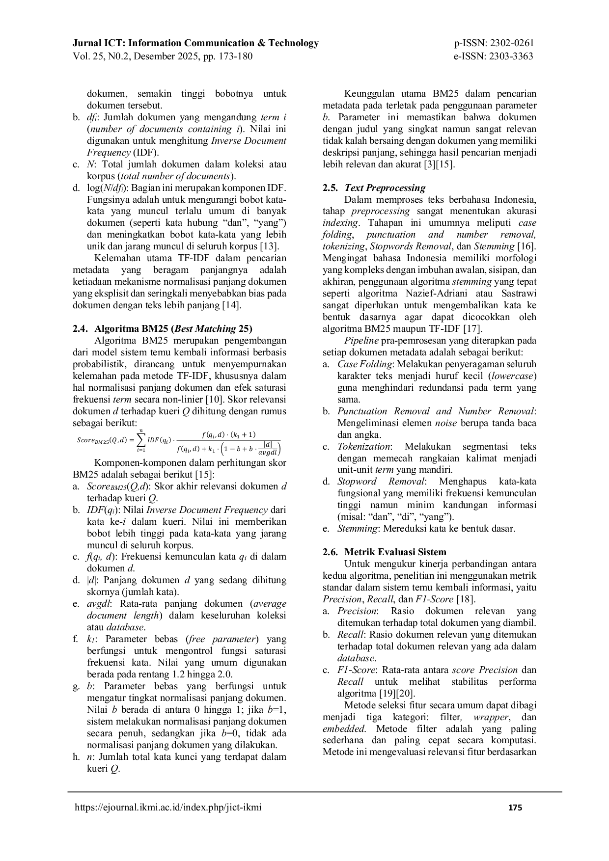 Jurnal ICT: Information Communication & TechnologyJurnal ICT: Information Communication & TechnologyPertumbuhan publikasi ilmiah di Indonesia menuntut mekanisme pencarian metadata yang efisien. Penelitian ini bertujuan membandingkan performa algoritma Term Frequency-Inverse Document Frequency (TF-IDF) dan Best Matching 25 (BM25) pada platform agregator Temujurnal.com. Metodologi yang digunakan meliputi pra-pemrosesan teks dan penerapan logika Hybrid Retrieval yang mengintegrasikan variabel tekstual dengan filter peringkat Sinta, bulan terbit dan biaya publikasi. Pengujian dilakukan menggunakan 100 metadata jurnal dan 20 kueri uji dengan metrik evaluasi Precision, Recall, F1-Score, dan Mean Average Precision (MAP). Hasil penelitian menunjukkan bahwa BM25 secara signifikan mengungguli TF-IDF dengan nilai MAP 0,74 berbanding 0,59. Algoritma BM25 terbukti lebih stabil dalam menangani variasi panjang metadata jurnal dibandingkan TF-IDF. Penelitian ini merekomendasikan implementasi BM25 pada platform Temujurnal untuk meningkatkan akurasi dan efisiensi sistem temu kembali literatur ilmiah nasional.