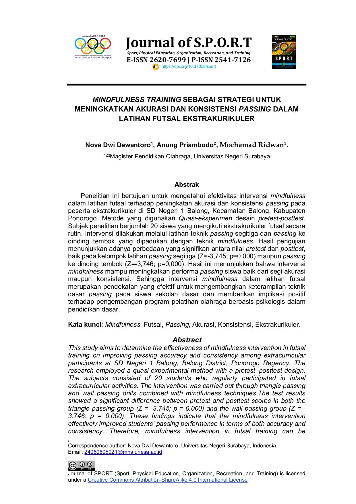 Journal of SPORT (Sport, Physical Education, Organization, Recreation, and Training)Journal of SPORT (Sport, Physical Education, Organization, Recreation, and Training)Penelitian ini bertujuan untuk mengetahui efektivitas intervensi mindfulness dalam latihan futsal terhadap peningkatan akurasi dan konsistensi passing pada peserta ekstrakurikuler di SD Negeri 1 Balong, Kecamatan Balong, Kabupaten Ponorogo. Metode yang digunakan Quasi-eksperimen desain pretest-posttest. Subjek penelitian berjumlah 20 siswa yang mengikuti ekstrakurikuler futsal secara rutin. Intervensi dilakukan melalui latihan teknik passing segitiga dan passing ke dinding tembok yang dipadukan dengan teknik mindfulness. Hasil pengujian menunjukkan adanya perbedaan yang signifikan antara nilai pretest dan posttest, baik pada kelompok latihan passing segitiga (Z=-3,745; p=0,000) maupun passing ke dinding tembok (Z=-3,746; p=0,000). Hasil ini menunjukkan bahwa intervensi mindfulness mampu meningkatkan performa passing siswa baik dari segi akurasi maupun konsistensi. Sehingga intervensi mindfulness dalam latihan futsal merupakan pendekatan yang efektif untuk mengembangkan keterampilan teknik dasar passing pada siswa sekolah dasar dan memberikan implikasi positif terhadap pengembangan program pelatihan olahraga berbasis psikologis dalam pendidikan dasar.