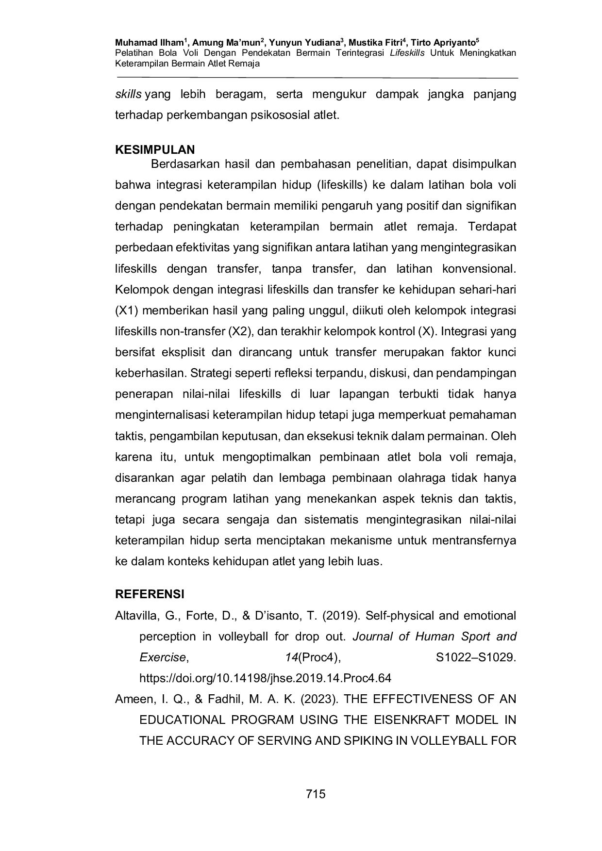 Penelitian ini menyimpulkan bahwa integrasi keterampilan hidup (lifeskills) ke dalam latihan bola voli dengan pendekatan bermain memiliki pengaruh positif dan signifikan terhadap peningkatan keterampilan bermain atlet remaja.Terdapat perbedaan efektivitas yang signifikan antara latihan yang mengintegrasikan lifeskills dengan transfer, tanpa transfer, dan latihan konvensional.Kelompok dengan integrasi lifeskills dan transfer ke kehidupan sehari-hari menunjukkan hasil yang paling unggul.Integrasi yang bersifat eksplisit dan dirancang untuk transfer merupakan faktor kunci keberhasilan.