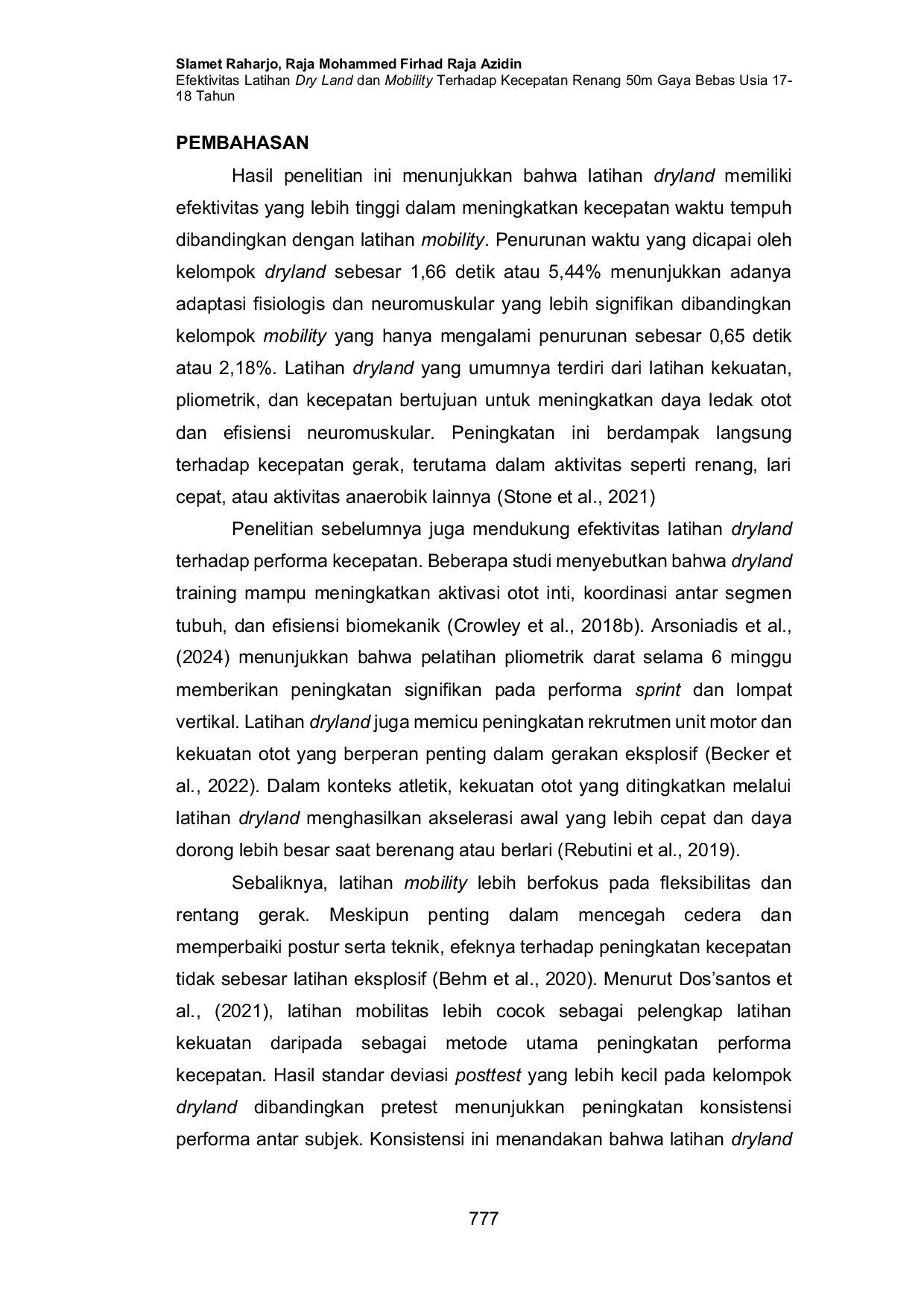 Latihan dry land terbukti lebih efektif dibandingkan latihan mobility dalam meningkatkan kecepatan waktu tempuh atlet, dengan penurunan waktu yang lebih besar dan konsistensi performa yang lebih tinggi.Kombinasi unsur kekuatan, pliometrik, dan kecepatan pada latihan dry land meningkatkan daya ledak otot, koordinasi gerak, serta efisiensi biomekanik, sehingga memperbaiki performa kecepatan.Sementara latihan mobility berperan sebagai pendukung fleksibilitas dan pencegahan cedera, namun dampaknya terhadap peningkatan kecepatan tidak sebesar latihan dry land.