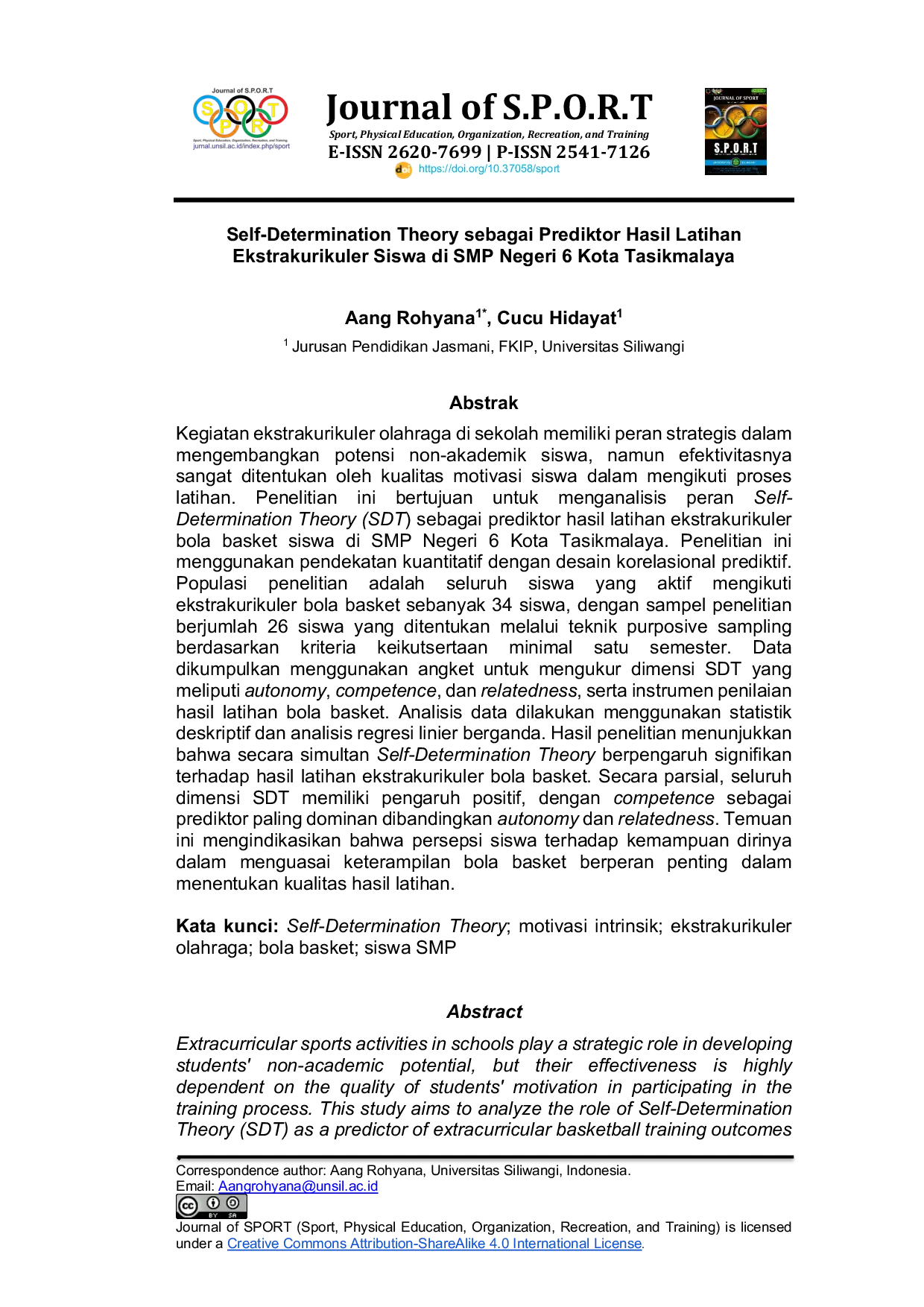 Journal of SPORT (Sport, Physical Education, Organization, Recreation, and Training)Journal of SPORT (Sport, Physical Education, Organization, Recreation, and Training)Kegiatan ekstrakurikuler olahraga di sekolah memiliki peran strategis dalam mengembangkan potensi non-akademik siswa, namun efektivitasnya sangat ditentukan oleh kualitas motivasi siswa dalam mengikuti proses latihan. Penelitian ini bertujuan untuk menganalisis peran Self-Determination Theory (SDT) sebagai prediktor hasil latihan ekstrakurikuler bola basket siswa di SMP Negeri 6 Kota Tasikmalaya. Penelitian ini menggunakan pendekatan kuantitatif dengan desain korelasional prediktif. Populasi penelitian adalah seluruh siswa yang aktif mengikuti ekstrakurikuler bola basket sebanyak 34 siswa, dengan sampel penelitian berjumlah 26 siswa yang ditentukan melalui teknik purposive sampling berdasarkan kriteria keikutsertaan minimal satu semester. Data dikumpulkan menggunakan angket untuk mengukur dimensi SDT yang mencakup autonomy, competence, dan relatedness, serta instrumen penilaian hasil latihan bola basket. Analisis data dilakukan menggunakan statistik deskriptif dan analisis regresi linier berganda. Hasil penelitian menunjukkan bahwa secara simultan Self-Determination Theory berpengaruh signifikan terhadap hasil latihan ekstrakurikuler bola basket. Secara parsial, seluruh dimensi SDT memiliki pengaruh positif, dengan competence sebagai prediktor paling dominan dibandingkan autonomy dan relatedness. Temuan ini mengindikasikan bahwa persepsi siswa terhadap kemampuan dirinya dalam menguasai keterampilan bola basket berperan penting dalam menentukan kualitas hasil latihan.