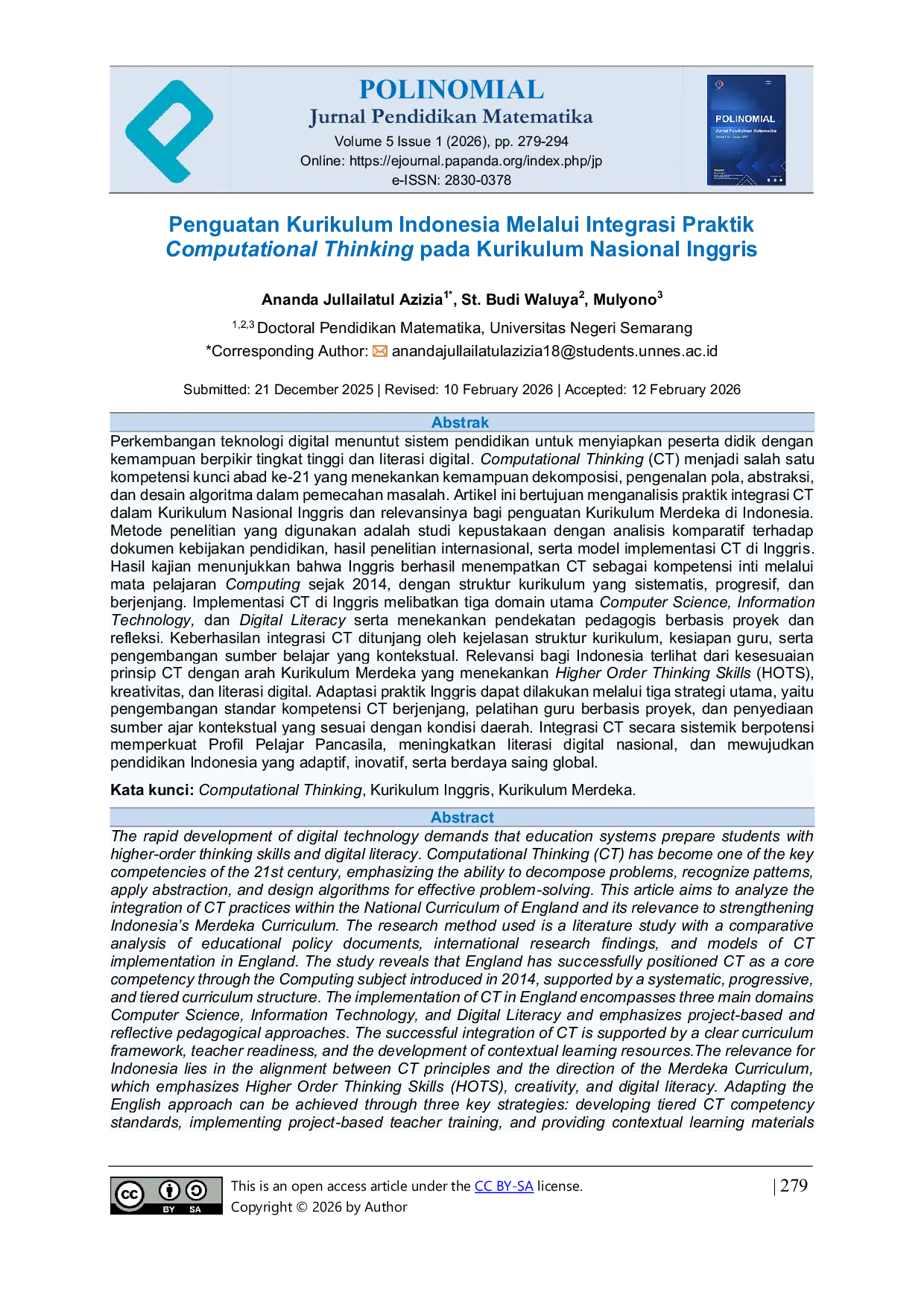 Polinomial : Jurnal Pendidikan MatematikaPolinomial : Jurnal Pendidikan MatematikaPerkembangan teknologi digital menuntut sistem pendidikan untuk menyiapkan peserta didik dengan kemampuan berpikir tingkat tinggi dan literasi digital. Computational Thinking (CT) menjadi salah satu kompetensi kunci abad ke-21 yang menekankan kemampuan dekomposisi, pengenalan pola, abstraksi, dan desain algoritma dalam pemecahan masalah. Artikel ini bertujuan menganalisis praktik integrasi CT dalam Kurikulum Nasional Inggris dan relevansinya bagi penguatan Kurikulum Merdeka di Indonesia. Metode penelitian yang digunakan adalah studi kepustakaan dengan analisis komparatif terhadap dokumen kebijakan pendidikan, hasil penelitian internasional, serta model implementasi CT di Inggris. Hasil kajian menunjukkan bahwa Inggris berhasil menempatkan CT sebagai kompetensi inti melalui mata pelajaran Computing sejak 2014, dengan struktur kurikulum yang sistematis, progresif, dan berjenjang. Implementasi CT di Inggris melibatkan tiga domain utama Computer Science, Information Technology, dan Digital Literacy serta menekankan pendekatan pedagogis berbasis proyek dan refleksi. Keberhasilan integrasi CT ditunjang oleh kejelasan struktur kurikulum, kesiapan guru, serta pengembangan sumber belajar yang kontekstual. Relevansi bagi Indonesia terlihat dari kesesuaian prinsip CT dengan arah Kurikulum Merdeka yang menekankan Higher Order Thinking Skills (HOTS), kreativitas, dan literasi digital. Adaptasi praktik Inggris dapat dilakukan melalui tiga strategi utama, yaitu pengembangan standar kompetensi CT berjenjang, pelatihan guru berbasis proyek, dan penyediaan sumber ajar kontekstual yang sesuai dengan kondisi daerah. Integrasi CT secara sistemik berpotensi memperkuat Profil Pelajar Pancasila, meningkatkan literasi digital nasional, dan mewujudkan pendidikan Indonesia yang adaptif, inovatif, serta berdaya saing global.