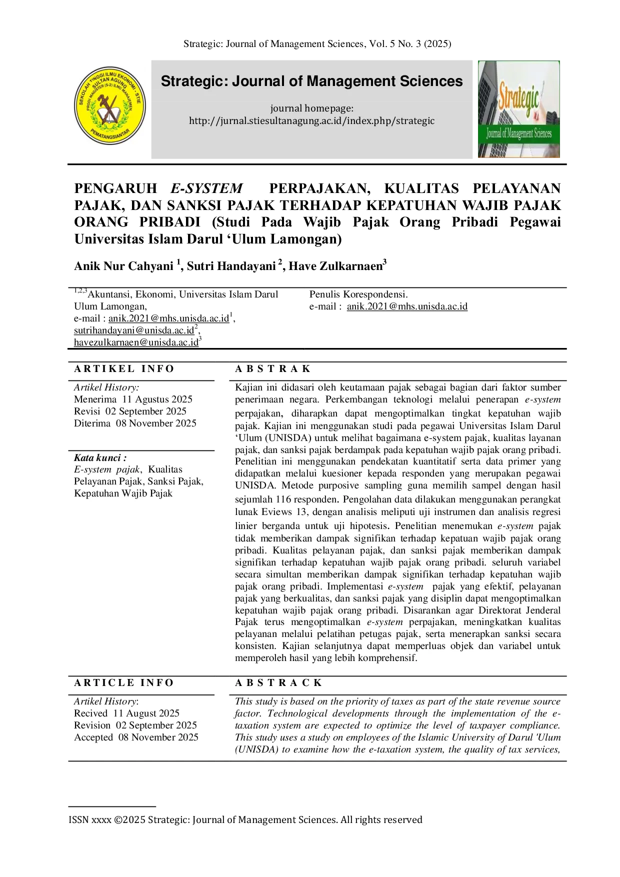 Strategic: Journal of Management SciencesStrategic: Journal of Management SciencesKajian ini didasari oleh keutamaan pajak sebagai bagian dari faktor sumber penerimaan negara. Perkembangan teknologi melalui penerapan e-system perpajakan, diharapkan dapat mengoptimalkan tingkat kepatuhan wajib pajak. Kajian ini menggunakan studi pada pegawai Universitas Islam Darul Ulum (UNISDA) untuk melihat bagaimana e-system pajak, kualitas layanan pajak, dan sanksi pajak berdampak pada kepatuhan wajib pajak orang pribadi. Penelitian ini menggunakan pendekatan kuantitatif serta data primer yang didapatkan melalui kuesioner kepada responden yang merupakan pegawai UNISDA. Metode purposive sampling guna memilih sampel dengan hasil sejumlah 116 responden. Pengolahan data dilakukan menggunakan perangkat lunak Eviews 13, dengan analisis meliputi uji instrumen dan analisis regresi linier berganda untuk uji hipotesis. Penelitian menemukan e-system pajak tidak memberikan dampak signifikan terhadap kepatuhan wajib pajak orang pribadi. Kualitas pelayanan pajak dan sanksi pajak memberikan dampak signifikan terhadap kepatuhan wajib pajak orang pribadi. Seluruh variabel secara simultan memberikan dampak signifikan terhadap kepatuhan wajib pajak orang pribadi. Implementasi e-system pajak yang efektif, pelayanan pajak yang berkualitas, dan sanksi pajak yang disiplin dapat mengoptimalkan kepatuhan wajib pajak orang pribadi. Disarankan agar Direktorat Jenderal Pajak terus mengoptimalkan e-system perpajakan, meningkatkan kualitas pelayanan melalui pelatihan petugas pajak, serta menerapkan sanksi secara konsisten. Kajian selanjutnya dapat memperluas objek dan variabel untuk memperoleh hasil yang lebih komprehensif.