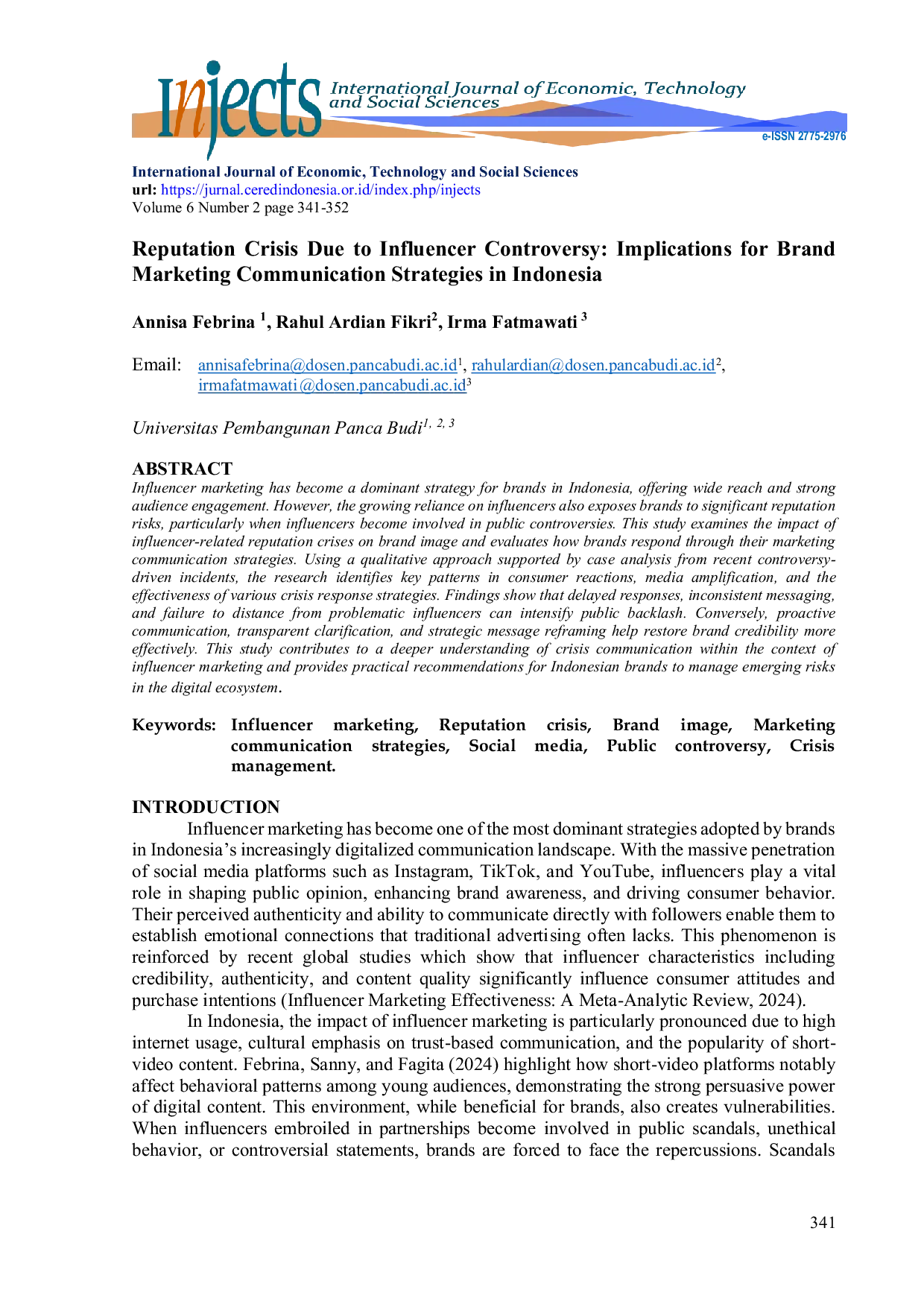 International Journal of Economic, Technology and Social Sciences (Injects)International Journal of Economic, Technology and Social Sciences (Injects)Influencer marketing has become a dominant strategy for brands in Indonesia, offering wide reach and strong audience engagement. However, the growing reliance on influencers also exposes brands to significant reputation risks, particularly when influencers become involved in public controversies. This study examines the impact of influencer-related reputation crises on brand image and evaluates how brands respond through their marketing communication strategies. Using a qualitative approach supported by case analysis from recent controversy-driven incidents, the research identifies key patterns in consumer reactions, media amplification, and the effectiveness of various crisis response strategies. Findings show that delayed responses, inconsistent messaging, and failure to distance from problematic influencers can intensify public backlash. Conversely, proactive communication, transparent clarification, and strategic message reframing help restore brand credibility more effectively. This study contributes to a deeper understanding of crisis communication within the context of influencer marketing and provides practical recommendations for Indonesian brands to manage emerging risks in the digital ecosystem.