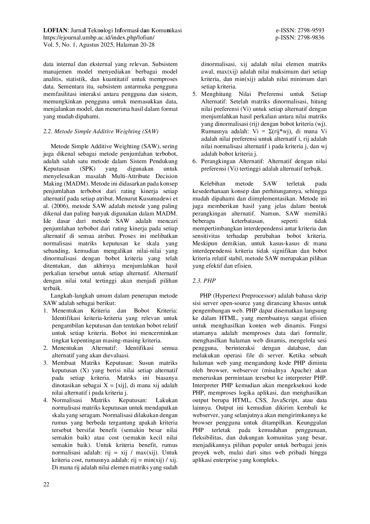 LOFIAN: Jurnal Teknologi Informasi dan KomunikasiLOFIAN: Jurnal Teknologi Informasi dan KomunikasiSistem Pendukung Keputusan (SPK) telah menjadi bagian integral dalam berbagai organisasi dan lembaga pemerintahan, termasuk Dinas Pemberdayaan Masyarakat dan Desa (PMD) Kabupaten Karo. Dalam konteks ini, pemilihan desa terbaik menjadi hal yang krusial untuk memastikan efektivitas program pembangunan dan pemberdayaan masyarakat desa. Oleh karena itu, penelitian ini bertujuan untuk mengembangkan sebuah SPK yang menggunakan metode Simple Additive Weighting (SAW) untuk menentukan desa terbaik di Kabupaten Karo. SPK ini dirancang untuk membantu pimpinan Dinas PMD dalam proses pengambilan keputusan terkait pemilihan desa terbaik. Metode SAW digunakan untuk menghitung nilai kinerja setiap desa berdasarkan lima kriteria yang relevan: Tata Kelola Pemerintahan Desa, Partisipasi Masyarakat, Inovasi Desa, Kesehatan dan Pendidikan, serta Potensi Ekonomi Desa. Setiap kriteria diberi bobot sesuai dengan tingkat kepentingannya dalam konteks penilaian. Dalam penggunaannya, SPK ini mengharuskan pengguna untuk menginput data kinerja desa berdasarkan kriteria yang telah ditetapkan. Kemudian, sistem akan melakukan perhitungan berdasarkan bobot kriteria dan menghasilkan peringkat desa berdasarkan penilaian mereka. Hasil ini dapat digunakan untuk mendukung keputusan terkait alokasi sumber daya, program pembinaan, atau pemberian apresiasi kepada desa. Selain itu, SPK ini dapat memberikan manfaat tambahan berupa transparansi dalam proses penilaian, yang dapat meningkatkan motivasi dan kinerja desa. Penelitian ini merupakan kontribusi penting dalam upaya meningkatkan efektivitas manajemen pembangunan desa di Kabupaten Karo. Dengan menggunakan pendekatan SAW dalam SPK ini, diharapkan Dinas PMD dapat lebih mudah mengidentifikasi dan mempertahankan desa-desa berkinerja tinggi, yang pada gilirannya akan berkontribusi pada pencapaian tujuan pembangunan desa dengan lebih baik.