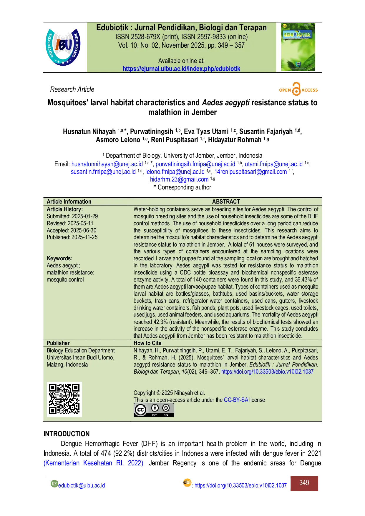 - Mosquitoes' larval habitat characteristics and Aedes aegypti resistance status to malathion in Jember... doi.org/10.33503/ebio.v10i02.1037Mosquitoes larval habitat characteristics and Aedes aegypti resistance status to malathion in Jember doi 10 33503 ebio v10i02 1037