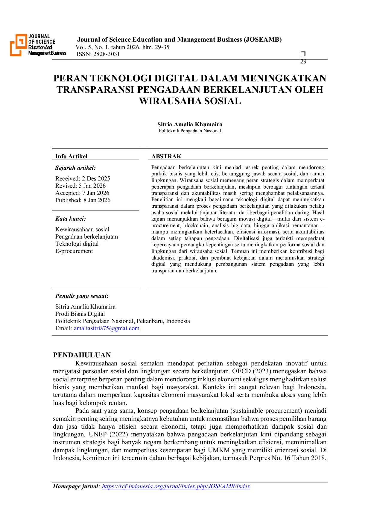 Journal of Science Education and Management BusinessJournal of Science Education and Management BusinessPengadaan berkelanjutan kini menjadi aspek penting dalam mendorong praktik bisnis yang lebih etis, bertanggung jawab secara sosial, dan ramah lingkungan. Wirausaha sosial memegang peran strategis dalam memperkuat penerapan pengadaan berkelanjutan, meskipun berbagai tantangan terkait transparansi dan akuntabilitas masih sering menghambat pelaksanaannya. Penelitian ini mengkaji bagaimana teknologi digital dapat meningkatkan transparansi dalam proses pengadaan berkelanjutan yang dilakukan pelaku usaha sosial melalui tinjauan literatur dari berbagai penelitian daring. Hasil kajian menunjukkan bahwa beragam inovasi digital—mulai dari sistem e-procurement, blockchain, analisis big data, hingga aplikasi pemantauan—mampu meningkatkan keterlacakan, efisiensi informasi, serta akuntabilitas dalam setiap tahapan pengadaan. Digitalisasi juga terbukti memperkuat kepercayaan pemangku kepentingan serta meningkatkan performa sosial dan lingkungan dari wirausaha sosial. Temuan ini memberikan kontribusi bagi akademisi, praktisi, dan pembuat kebijakan dalam merumuskan strategi digital yang mendukung pembangunan sistem pengadaan yang lebih transparan dan berkelanjutan.
