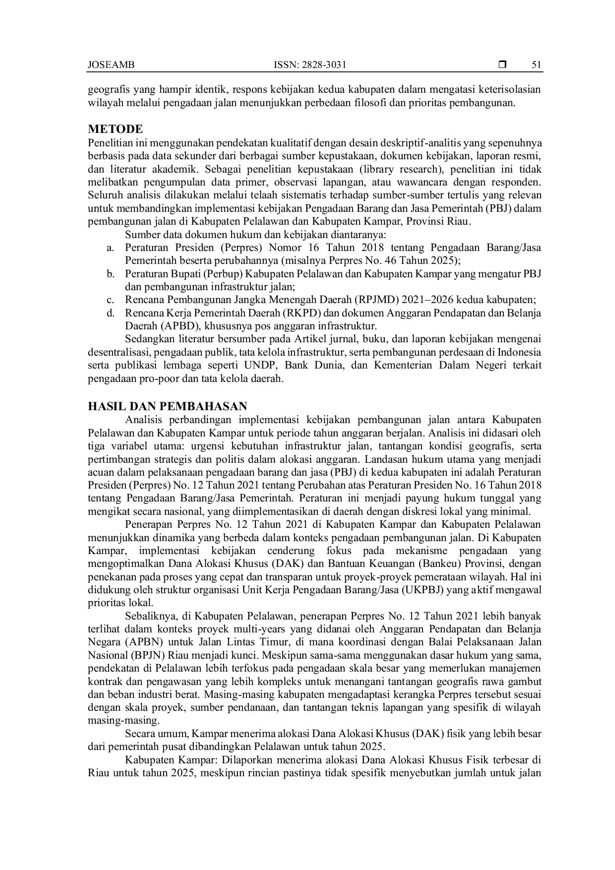 Journal of Science Education and Management BusinessJournal of Science Education and Management BusinessPenelitian ini menganalisis perbandingan implementasi kebijakan pembangunan jalan di Kabupaten Pelalawan dan Kabupaten Kampar, Provinsi Riau, dengan mengacu pada Peraturan Presiden Nomor 12 Tahun 2021 sebagai kerangka hukum tunggal. Meskipun berada dalam payung regulasi yang sama, kedua kabupaten menunjukkan pendekatan yang berbeda dalam merespons tiga variabel utama: urgensi kebutuhan infrastruktur, tantangan geografis berupa lahan gambut dan akses terbatas, serta pertimbangan strategis-politis dalam alokasi anggaran. Kabupaten Kampar mengoptimalkan Dana Alokasi Khusus (DAK) dan Bantuan Keuangan Provinsi untuk membangun jaringan jalan desa secara merata, didukung oleh struktur pengadaan daerah yang responsif dan metode pengadaan fleksibel. Sebaliknya, Kabupaten Pelalawan fokus pada proyek skala besar khususnya Jalan Lintas Timur yang didanai APBN dan melibatkan koordinasi dengan instansi pusat. Hasilnya, Kampar mencatat 68,2% jalan dalam kondisi baik dan 91,3% desa terhubung jalan layak, sedangkan Pelalawan masih menghadapi kerusakan jalan signifikan (42,6%) di wilayah pedalaman. Perbedaan ini mencerminkan orientasi pembangunan yang kontras: Kampar menekankan pemerataan akses dan kebutuhan lokal, sementara Pelalawan cenderung responsif terhadap kepentingan korporasi dan koridor ekonomi strategis.