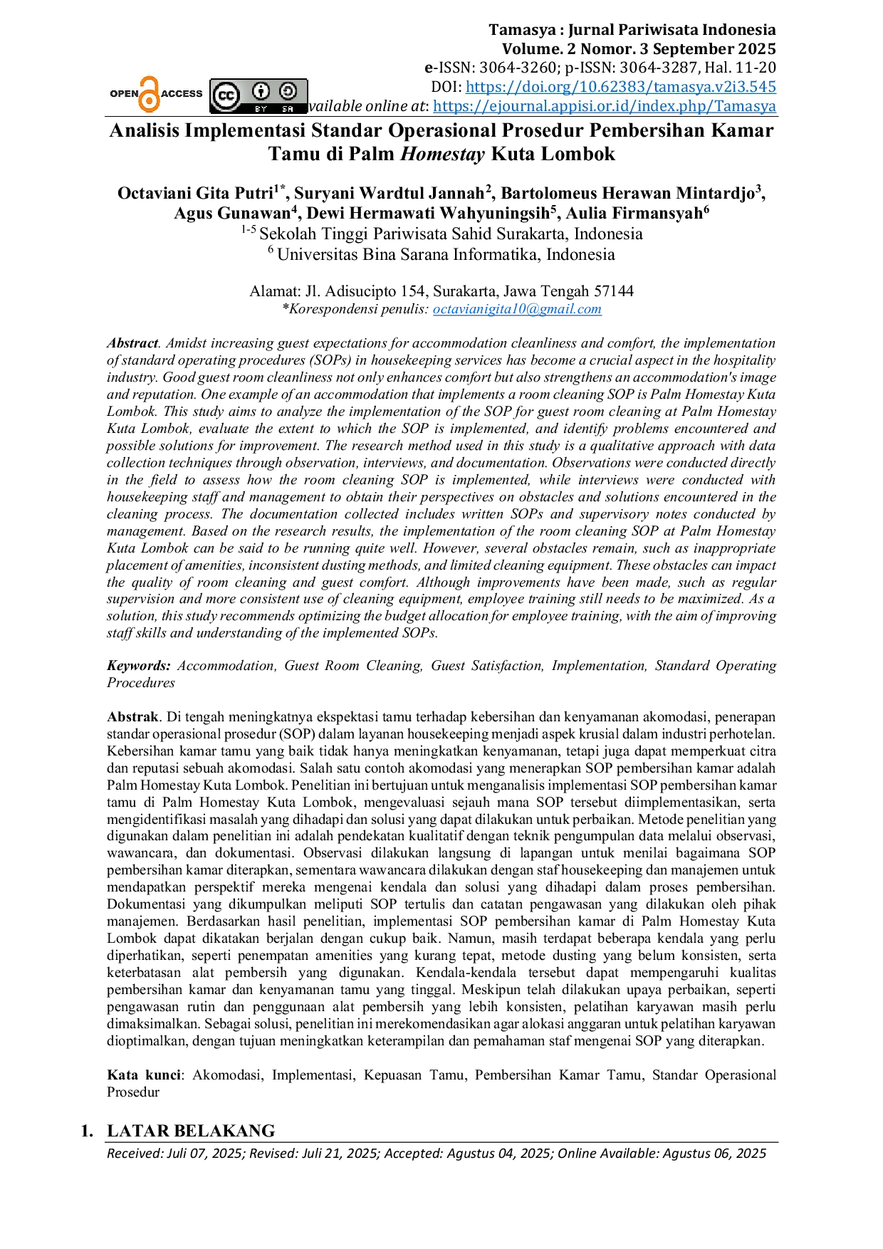 Tamasya : Jurnal Pariwisata IndonesiaTamasya : Jurnal Pariwisata IndonesiaDi tengah meningkatnya ekspektasi tamu terhadap kebersihan dan kenyamanan akomodasi, penerapan standar operasional prosedur (SOP) dalam layanan housekeeping menjadi aspek krusial dalam industri perhotelan. Kebersihan kamar tamu yang baik tidak hanya meningkatkan kenyamanan, tetapi juga dapat memperkuat citra dan reputasi sebuah akomodasi. Salah satu contoh akomodasi yang menerapkan SOP pembersihan kamar adalah Palm Homestay Kuta Lombok. Penelitian ini bertujuan untuk menganalisis implementasi SOP pembersihan kamar tamu di Palm Homestay Kuta Lombok, mengevaluasi sejauh mana SOP tersebut diimplementasikan, serta mengidentifikasi masalah yang dihadapi dan solusi yang dapat dilakukan untuk perbaikan. Metode penelitian yang digunakan dalam penelitian ini adalah pendekatan kualitatif dengan teknik pengumpulan data melalui observasi, wawancara, dan dokumentasi. Berdasarkan hasil penelitian, implementasi SOP pembersihan kamar di Palm Homestay Kuta Lombok dapat dikatakan berjalan dengan cukup baik. Namun, masih terdapat beberapa kendala yang perlu diperhatikan, seperti penempatan amenities yang kurang tepat, metode dusting yang belum konsisten, serta keterbatasan alat pembersih yang digunakan. Kendala-kendala tersebut dapat mempengaruhi kualitas pembersihan kamar dan kenyamanan tamu yang tinggal. Meskipun telah dilakukan upaya perbaikan, seperti pengawasan rutin dan penggunaan alat pembersih yang lebih konsisten, pelatihan karyawan masih perlu dimaksimalkan. Sebagai solusi, penelitian ini merekomendasikan agar alokasi anggaran untuk pelatihan karyawan dioptimalkan, dengan tujuan meningkatkan keterampilan dan pemahaman staf mengenai SOP yang diterapkan.