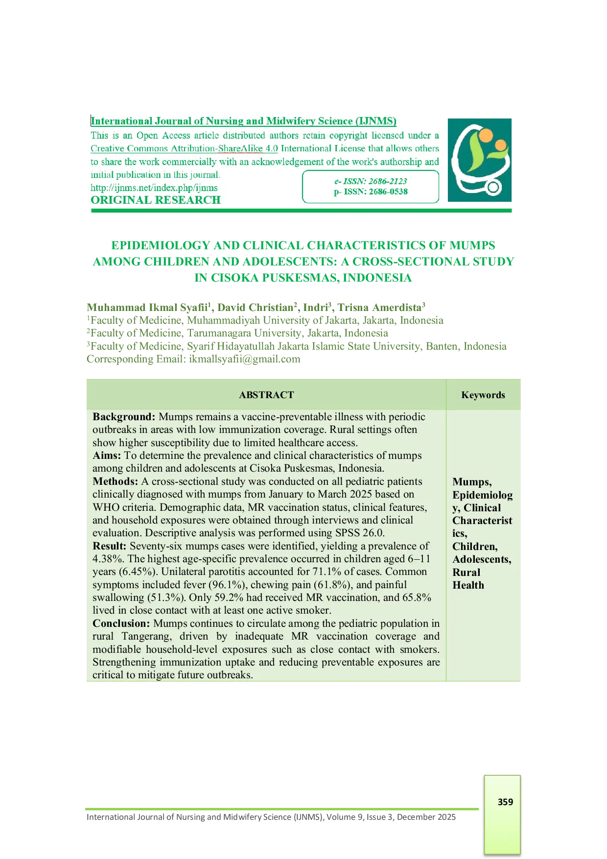 International Journal of Nursing and Midwifery Science (IJNMS)International Journal of Nursing and Midwifery Science (IJNMS)Mumps remains a vaccine-preventable illness with periodic outbreaks in areas with low immunization coverage. Rural settings often show higher susceptibility due to limited healthcare access. Penelitian ini bertujuan untuk menentukan prevalensi dan karakteristik klinis mumps pada anak-anak dan remaja di Puskesmas Cisoka, Indonesia. Metode yang digunakan adalah studi cross-sectional pada semua pasien anak yang secara klinis didiagnosis mumps dari Januari hingga Maret 2025 berdasarkan kriteria WHO. Data demografis, status vaksinasi MR, fitur klinis, dan paparan rumah tangga diperoleh melalui wawancara dan evaluasi klinis. Analisis deskriptif dilakukan menggunakan SPSS 26.0. Hasil penelitian mengidentifikasi 76 kasus mumps, menghasilkan prevalensi 4,38%. Prevalensi spesifik usia tertinggi terjadi pada anak-anak berusia 6–11 tahun (6,45%). Parotitis unilateral menyumbang 71,1% dari kasus. Gejala umum termasuk demam (96,1%), nyeri mengunyah (61,8%), dan kesulitan menelan (51,3%). Hanya 59,2% yang telah menerima vaksinasi MR, dan 65,8% tinggal dalam kontak dekat dengan setidaknya satu perokok aktif. Penelitian ini menyimpulkan bahwa mumps terus beredar di kalangan populasi anak-anak di Tangerang pedesaan, didorong oleh cakupan vaksinasi MR yang tidak memadai dan paparan tingkat rumah tangga yang dapat diubah seperti kontak dekat dengan perokok. Penguatan pengambilan vaksin dan pengurangan paparan yang dapat dicegah sangat penting untuk mengurangi wabah di masa depan.