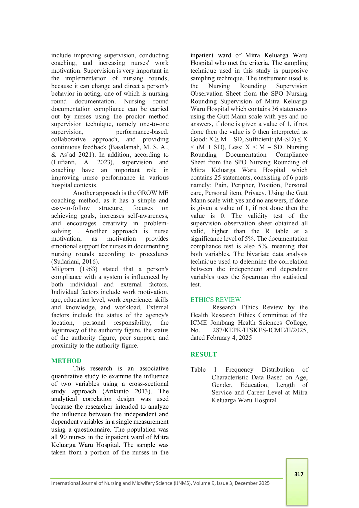 Supervisi nursing round di ruang perawatan anak Rumah Sakit Mitra Keluarga Waru umumnya baik.Supervisi yang baik dapat meningkatkan kepatuhan dokumentasi nursing round.Oleh karena itu, disarankan untuk meningkatkan supervisi dan kepatuhan dokumentasi nursing round di ruang perawatan anak.