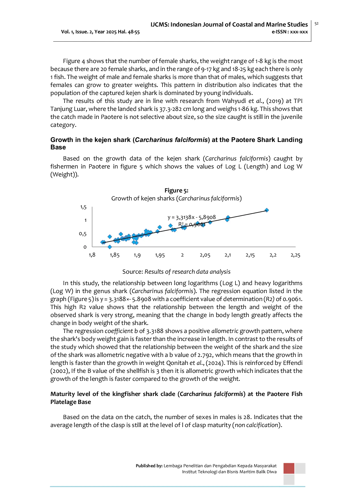 Indonesian Journal of Coastal and Marine StudiesIndonesian Journal of Coastal and Marine StudiesPenelitian ini dilakukan untuk menganalisis biologi ikan hiu kejen (Carcharinus falciformis) yang diturunkan di Pangkalan Pendaratan Ikan (PPI) Paotere. Penelitian dilakukan pada bulan Januari-Maret 2025 di Pangkalan Pendaratan Ikan Paotere kota Makassar. Variabel penelitian ini yaitu, struktur ukuran, pertumbuhan, tingkat kematangan klasper, dan perbandingan jenis kelamin hiu kejen. metode penelitian yang digunakan adalah survei langsung dengan pengambilan data melalui pengukuran panjang total, berat, pengamatan tingat kematangan klasper serta perbandingan jenis kelamin pada hiu kejen yang telah didaratkan.