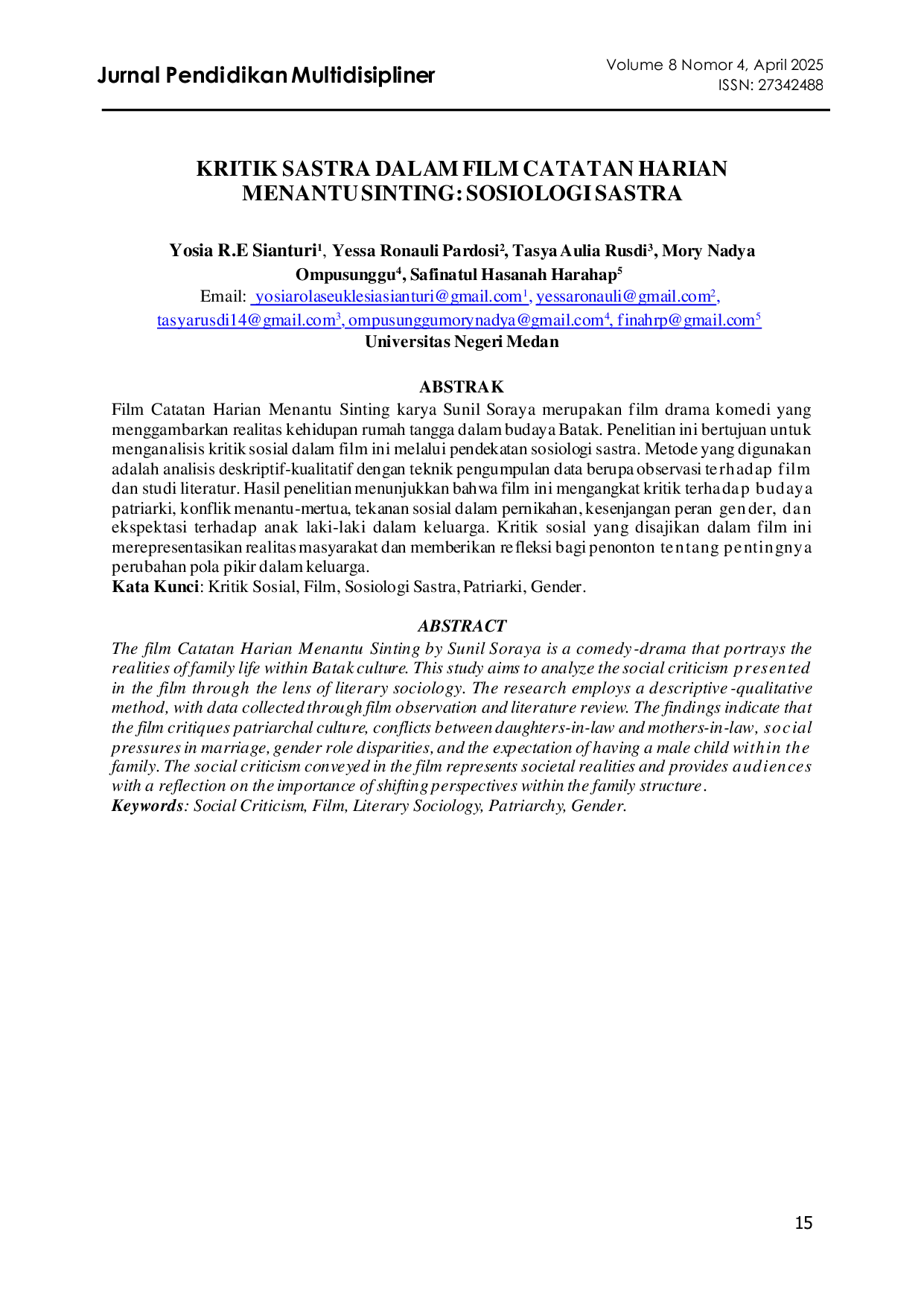 Jurnal Pendidikan MultidisiplinerJurnal Pendidikan MultidisiplinerFilm Catatan Harian Menantu Sinting karya Sunil Soraya merupakan film drama komedi yang menggambarkan realitas kehidupan rumah tangga dalam budaya Batak. Penelitian ini bertujuan untuk menganalisis kritik sosial dalam film ini melalui pendekatan sosiologi sastra. Metode yang digunakan adalah analisis deskriptif-kualitatif dengan teknik pengumpulan data berupa observasi terhadap film dan studi literatur. Hasil penelitian menunjukkan bahwa film ini mengangkat kritik terhadap budaya patriarki, konflik menantu-mertua, tekanan sosial dalam pernikahan, kesenjangan peran gender, dan ekspektasi terhadap anak laki-laki dalam keluarga. Kritik sosial yang disajikan dalam film ini merepresentasikan realitas masyarakat dan memberikan refleksi bagi penonton tentang pentingnya perubahan pola pikir dalam keluarga.