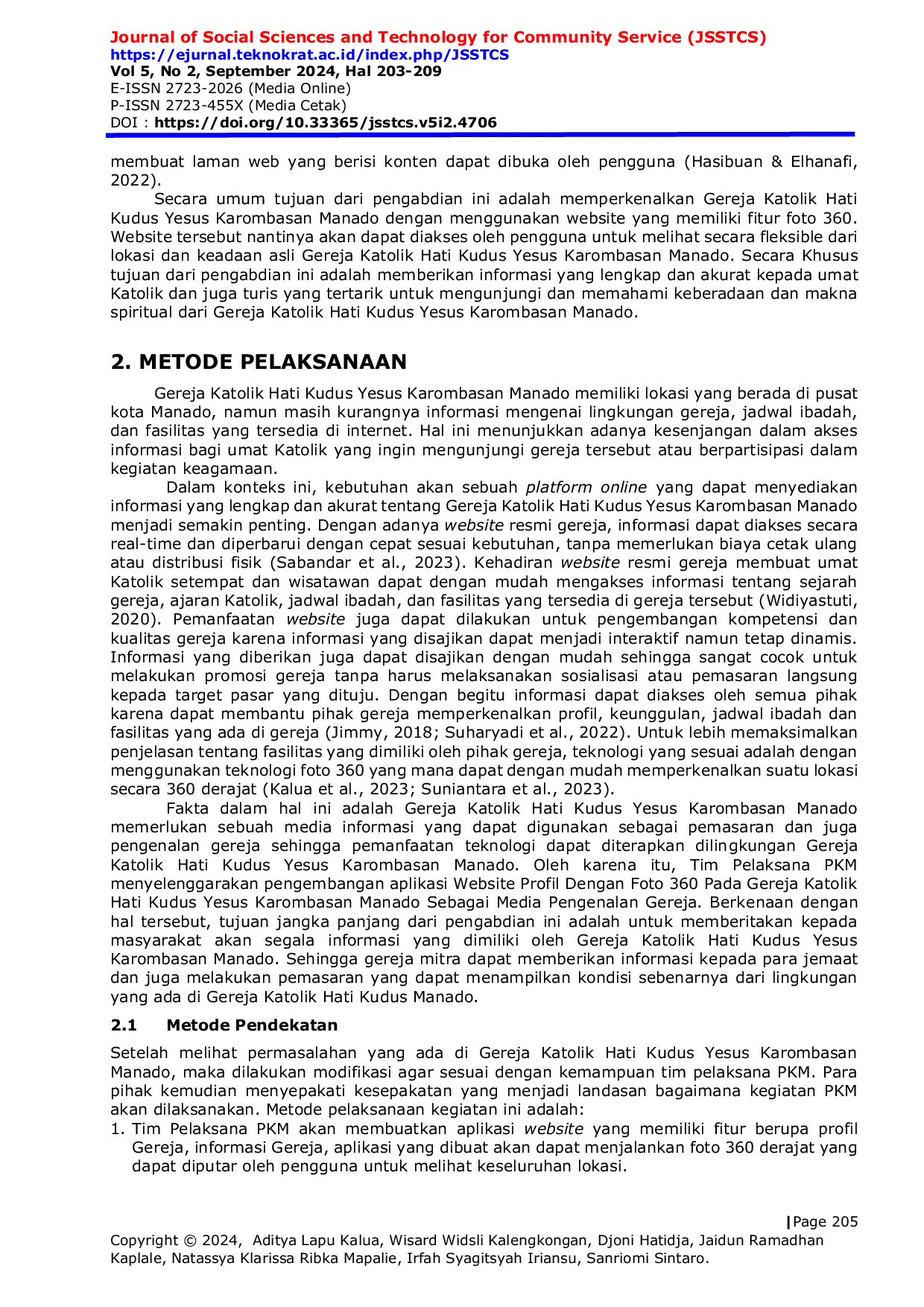 Journal of Social Sciences and Technology for Community Service (JSSTCS)Journal of Social Sciences and Technology for Community Service (JSSTCS)Abstrak-Gereja Katolik Hati Kudus Yesus Karombasan Manado merupakan Gereja Katolik yang berada di Jalan Sam Ratulangi, Karombasan Utara, Kecamatan Wanea, Kota Manado, Provinsi Sulawesi Utara. Gereja Katolik Hati Kudus Yesus Karombasan Manado saat ini memiliki bangunan yang berjarak sekitar 18 kilometer dari Bandar Udara Sam Ratulangi dan 6 kilometer dari Pelabuhan Manado dengan lokasinya yang strategis Gereja Katolik Hati Kudus Yesus Karombasan Manado mudah dijangkau oleh turis untuk beribadah. Meskipun Gereja Katolik Hati Kudus Yesus Karombasan Manado memiliki lokasi yang berada di pusat kota Manado, namun masih kurangnya informasi mengenai lingkungan gereja, jadwal ibadah, dan fasilitas yang tersedia. Hal ini dapat menjadi hambatan bagi orang-orang yang ingin mengunjungi gereja ini serta bagi umat Katolik yang ingin berpartisipasi dalam kegiatan keagamaan di Gereja Katolik Hati Kudus Yesus Karombasan. Informasi yang diberikan dapat disampaikan dengan mudah melalui teknologi website yang aman, yang sangat cocok untuk melakukan promosi dan penyampaian informasi tentang Gereja Katolik Hati Kudus Manado tanpa harus melaksanakan sosialisasi atau pemasaran langsung kepada masyarakat. Dengan adanya website resmi gereja, informasi tentang sejarah, ajaran, jadwal ibadah, dan fasilitas yang tersedia di gereja dapat diakses dengan mudah oleh semua pihak, baik umat Katolik setempat maupun wisatawan yang ingin mengunjungi gereja ini. Untuk lebih memperkuat penjelasan tentang fasilitas yang dimiliki oleh Gereja Katolik Hati Kudus Yesus Karombasan Manado, teknologi yang sesuai adalah dengan menggunakan teknologi foto 360 derajat. Dengan foto 360 derajat, orang-orang dapat mengenal suatu lokasi secara menyeluruh dan detail. Tujuan dari pelaksanaan pengabdian ini adalah membuat sebuah media informasi yang dapat digunakan sebagai sarana pengenalan gereja kepada masyarakat luas, baik dalam konteks lokal maupun global. Oleh karena itu, Tim Pelaksana PKM menyelenggarakan pengembangan aplikasi Website Profil Dengan Foto 360 untuk Gereja Katolik Hati Kudus Yesus Karombasan Manado. Dengan harapan bahwa website ini dapat memberikan informasi yang lengkap dan akurat kepada umat Katolik dan juga turis yang tertarik untuk mengunjungi dan memahami keberadaan dan makna spiritual dari Gereja Katolik Hati Kudus Yesus Karombasan Manado.