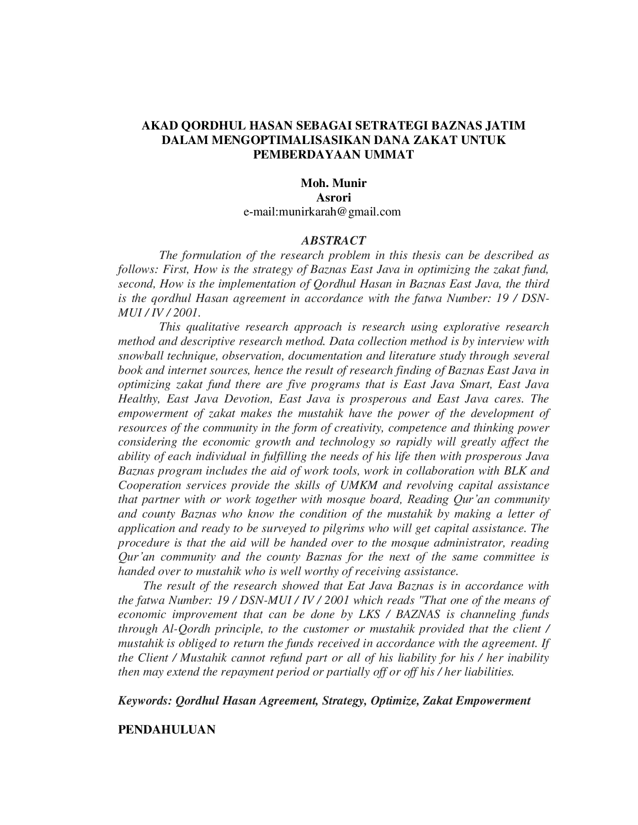 Jurnal Justisia Ekonomika: Magister Hukum Ekonomi SyariahJurnal Justisia Ekonomika: Magister Hukum Ekonomi SyariahPenelitian ini bertujuan untuk mengetahui strategi Baznas Jawa Timur dalam mengoptimalkan dana zakat, implementasi Qordhul Hasan di Baznas Jawa Timur, dan kesesuaian akad Qordhul Hasan dengan fatwa Nomor: 19 / DSN-MUI / IV / 2001. Penelitian ini menggunakan pendekatan kualitatif dengan metode penelitian exploratif dan deskriptif. Hasil penelitian menunjukkan bahwa Baznas Jawa Timur memiliki lima program, yaitu Jawa Timur Cerdas, Jawa Timur Sehat, Jawa Timur Devosi, Jawa Timur Sejahtera, dan Jawa Timur Peduli. Pemberdayaan zakat bertujuan untuk meningkatkan kemampuan sumber daya masyarakat dalam bentuk kreativitas, kompetensi, dan daya pikir, mengingat pertumbuhan ekonomi dan teknologi yang sangat cepat akan sangat mempengaruhi kemampuan setiap individu dalam memenuhi kebutuhan hidupnya. Program Jawa Timur Sejahtera dari Baznas meliputi bantuan alat kerja, kerja sama dengan BLK dan Dinas Koperasi untuk memberikan keterampilan UMKM dan bantuan modal bergulir yang bekerja sama dengan pengurus masjid, komunitas pengajian, dan Baznas kabupaten yang mengetahui kondisi mustahik dengan membuat surat permohonan dan siap untuk disurvei kepada mustahik yang akan menerima bantuan modal. Prosedurnya adalah bantuan akan diserahkan kepada pengurus masjid, komunitas pengajian, dan Baznas kabupaten, kemudian oleh komite yang sama diserahkan kepada mustahik yang layak menerima bantuan. Hasil penelitian menunjukkan bahwa Baznas Jawa Timur sesuai dengan fatwa Nomor: 19 / DSN-MUI / IV / 2001 yang berbunyi Salah satu sarana peningkatan perekonomian yang dapat dilakukan oleh LKS adalah penyaluran dana melalui prinsip Qordhul Hasan, yaitu suatu akad pinjaman kepada nasabah atau mustahiq dengan ketentuan bahwa nasabah atau mustahiq wajib mengembalikan dana yang diterimanya kepada LKS pada waktu yang telah disepakati oleh LKS dan nasabah atau mustahiq, agar akad tersebut sesuai dengan syariat Islam..