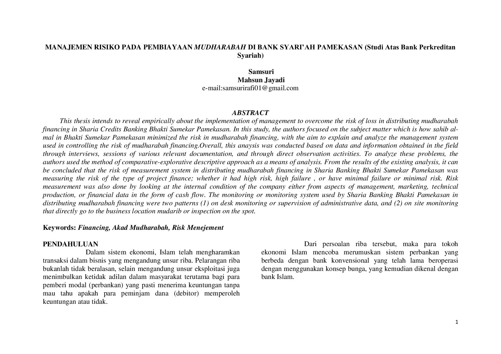 Jurnal Justisia Ekonomika: Magister Hukum Ekonomi SyariahJurnal Justisia Ekonomika: Magister Hukum Ekonomi SyariahPenelitian ini secara empiris mengkaji penerapan manajemen risiko untuk mengurangi kemungkinan kerugian pada pembiayaan mudharabah di Bank Syariah Bhakti Sumekar Pamekasan. Penelitian difokuskan pada upaya sahib al‑mal dalam meminimalkan risiko melalui analisis sistem manajemen yang meliputi pengukuran risiko proyek, evaluasi kondisi internal perusahaan (manajemen, pemasaran, produksi, dan arus kas), serta dua pola monitoring yaitu on‑desk dan on‑site. Data diperoleh melalui wawancara, dokumentasi relevan, dan observasi langsung, kemudian dianalisis dengan pendekatan deskriptif komparatif‑eksploratif.