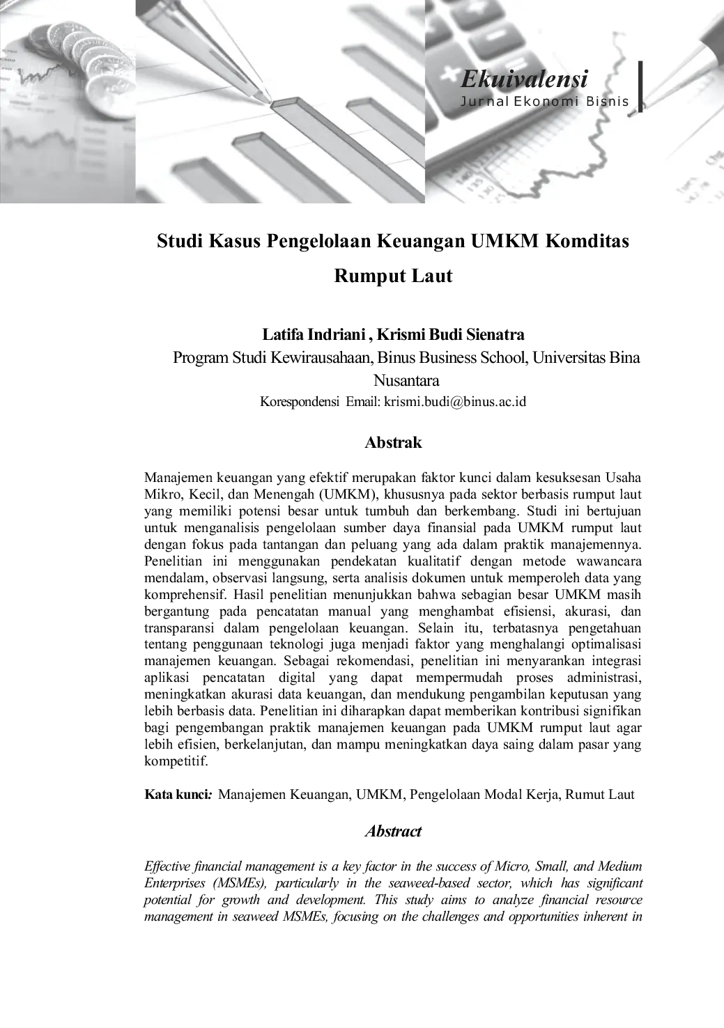 JURNAL EKUIVALENSIJURNAL EKUIVALENSIManajemen keuangan yang efektif merupakan faktor kunci dalam kesuksesan Usaha Mikro, Kecil, dan Menengah (UMKM), khususnya pada sektor berbasis rumput laut yang memiliki potensi besar untuk tumbuh dan berkembang. Studi ini bertujuan untuk menganalisis pengelolaan sumber daya finansial pada UMKM rumput laut dengan fokus pada tantangan dan peluang yang ada dalam praktik manajemennya. Penelitian ini menggunakan pendekatan kualitatif dengan metode wawancara mendalam, observasi langsung, serta analisis dokumen untuk memperoleh data yang komprehensif. Hasil penelitian menunjukkan bahwa sebagian besar UMKM masih bergantung pada pencatatan manual yang menghambat efisiensi, akurasi, dan transparansi dalam pengelolaan keuangan. Selain itu, terbatasnya pengetahuan tentang penggunaan teknologi juga menjadi faktor yang menghalangi optimalisasi manajemen keuangan. Sebagai rekomendasi, penelitian ini menyarankan integrasi aplikasi pencatatan digital yang dapat mempermudah proses administrasi, meningkatkan akurasi data keuangan, dan mendukung pengambilan keputusan yang lebih berbasis data. Penelitian ini diharapkan dapat memberikan kontribusi signifikan bagi pengembangan praktik manajemen keuangan pada UMKM rumput laut agar lebih efisien, berkelanjutan, dan mampu meningkatkan daya saing dalam pasar yang kompetitif.