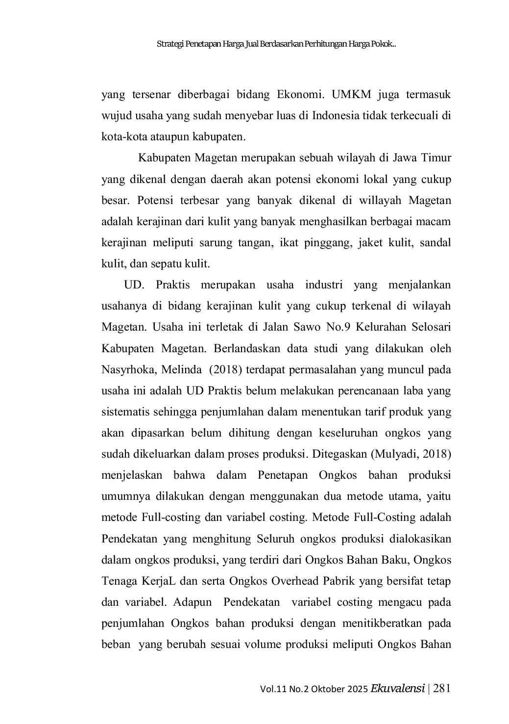 JURNAL EKUIVALENSIJURNAL EKUIVALENSIStudi ini bertujuan untuk menganalisis strategi penetapan harga jual berdasarkan perhitungan biaya produksi menggunakan teknik full-costing pada usaha kerajinan sepatu kulit UD. Praktis Magetan. Latar belakang studi ini adalah pentingnya penetapan harga jual yang tepat agar pelaku UMKM, khususnya Usaha Kerajinan Sepatu Kulit di Magetan, dapat memahami seluruh komponen biaya produksi secara menyeluruh guna menetapkan harga jual yang sesuai dan menghindari kerugian. Penetapan harga jual yang tepat sangat penting untuk menjamin kelangsungan dan profitabilitas usaha, terutama bagi pelaku Usaha Mikro Kecil dan Menengah (UMKM). Metode full-costing dipilih karena mempertimbangkan setiap aspek biaya, baik tetap maupun variabel, sehingga mampu memberikan gambaran biaya produksi secara komprehensif dan akurat. Metode yang digunakan dalam studi ini adalah metode deskriptif kuantitatif dengan pengumpulan data selama periode Mei hingga Juli 2025. Teknik pengumpulan data dilakukan melalui wawancara, dokumentasi, dan observasi langsung terhadap proses produksi, dengan fokus pada biaya bahan baku, biaya tenaga kerja langsung, dan biaya overhead pabrik.