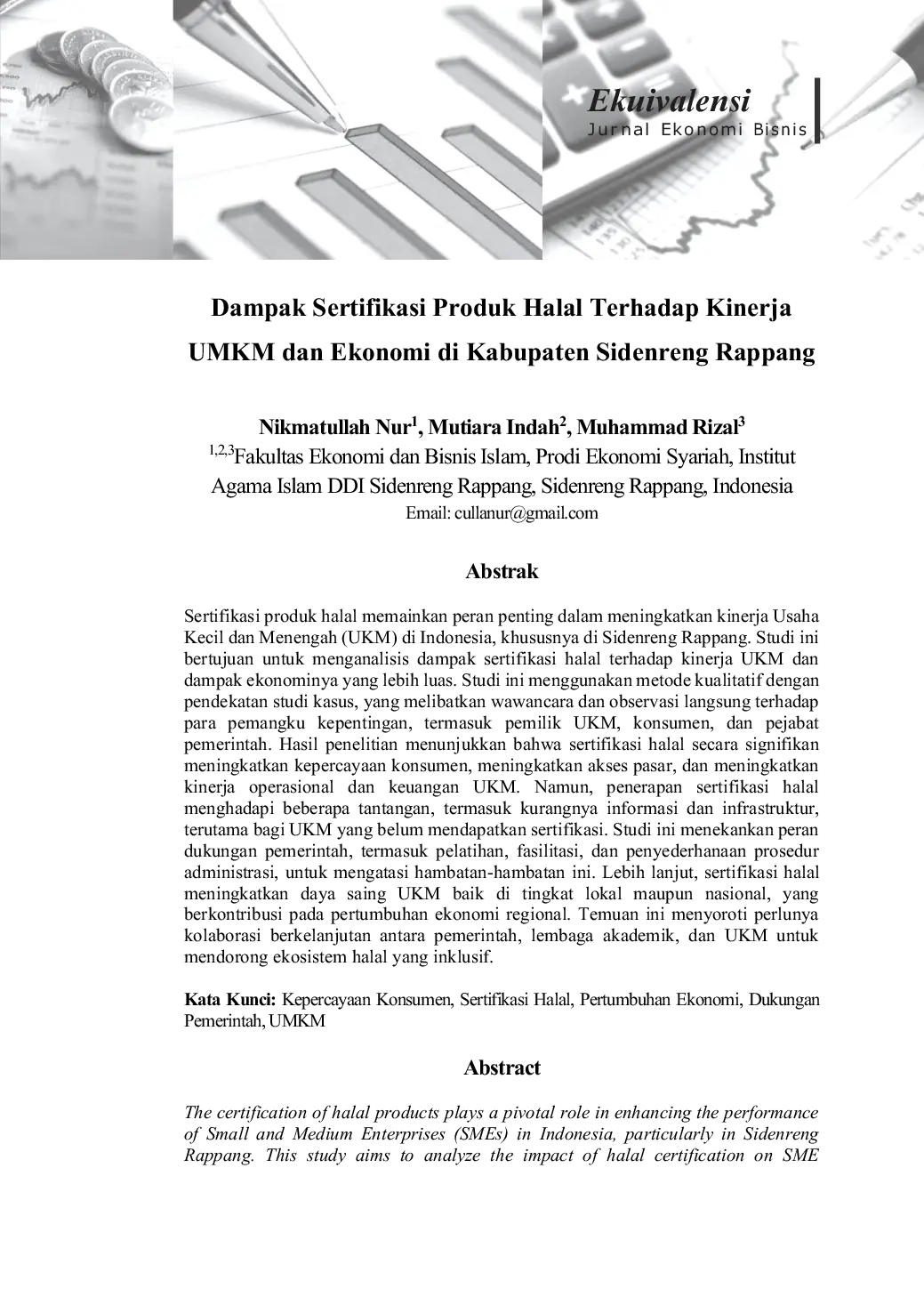 JURNAL EKUIVALENSIJURNAL EKUIVALENSISertifikasi produk halal memainkan peran penting dalam meningkatkan kinerja Usaha Kecil dan Menengah (UKM) di Indonesia, khususnya di Sidenreng Rappang. Studi ini bertujuan untuk menganalisis dampak sertifikasi halal terhadap kinerja UKM dan dampak ekonominya yang lebih luas. Studi ini menggunakan metode kualitatif dengan pendekatan studi kasus, yang melibatkan wawancara dan observasi langsung terhadap para pemangku kepentingan, termasuk pemilik UKM, konsumen, dan pejabat pemerintah. Hasil penelitian menunjukkan bahwa sertifikasi halal secara signifikan meningkatkan kepercayaan konsumen, meningkatkan akses pasar, dan meningkatkan kinerja operasional dan keuangan UKM. Namun, penerapan sertifikasi halal menghadapi beberapa tantangan, termasuk kurangnya informasi dan infrastruktur, terutama bagi UKM yang belum mendapatkan sertifikasi. Studi ini menekankan peran dukungan pemerintah, termasuk pelatihan, fasilitasi, dan penyederhanaan prosedur administrasi, untuk mengatasi hambatan-hambatan ini. Lebih lanjut, sertifikasi halal meningkatkan daya saing UKM baik di tingkat lokal maupun nasional, yang berkontribusi pada pertumbuhan ekonomi regional. Temuan ini menyoroti perlunya kolaborasi berkelanjutan antara pemerintah, lembaga akademik, dan UKM untuk mendorong ekosistem halal yang inklusif.