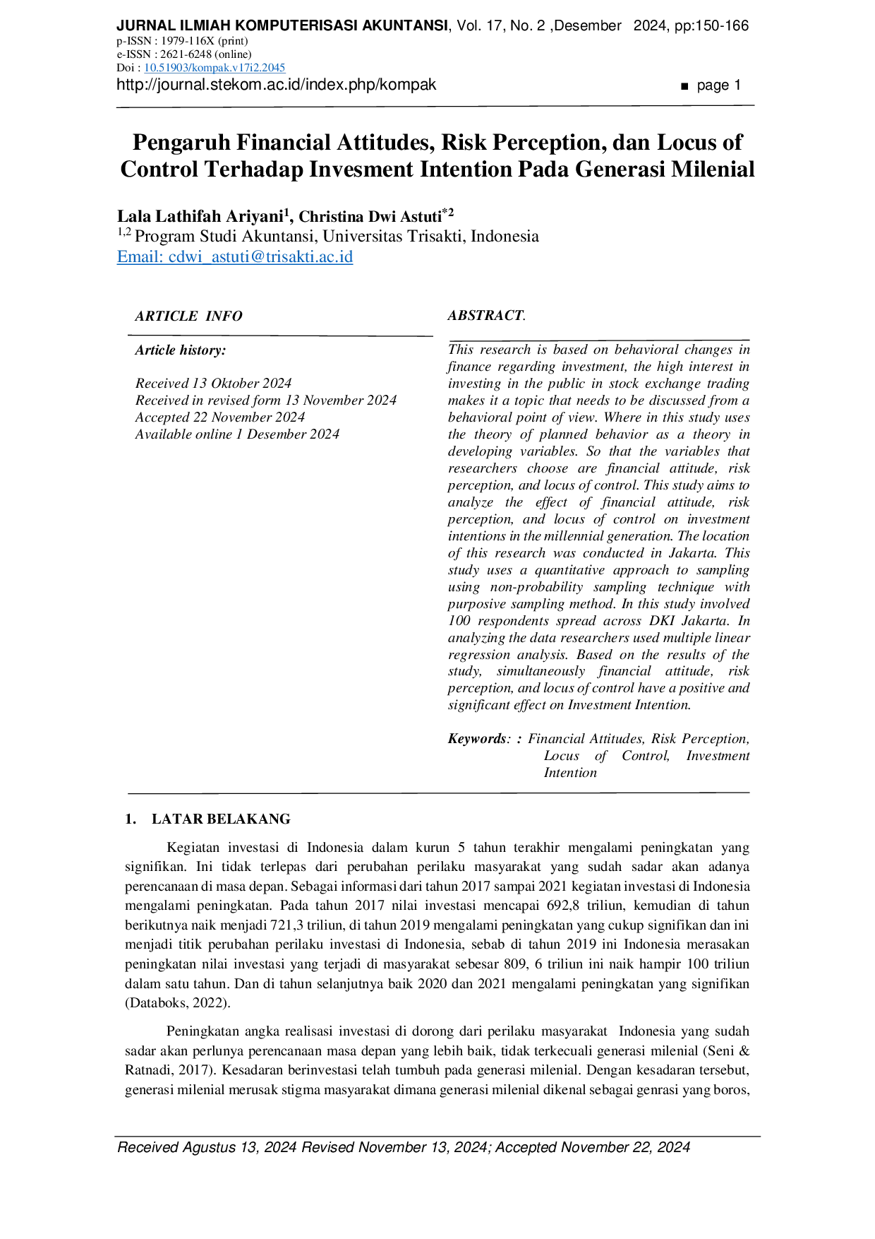 Kompak :Jurnal Ilmiah Komputerisasi AkuntansiKompak :Jurnal Ilmiah Komputerisasi AkuntansiPenelitian ini didasarkan pada perubahan perilaku dalam keuangan terkait investasi, di mana tingginya minat masyarakat untuk berinvestasi di pasar saham menjadikannya topik yang perlu dibahas dari sudut pandang perilaku. Penelitian ini menggunakan Theory of Planned Behavior sebagai kerangka untuk mengembangkan variabel, yaitu financial attitude, risk perception, dan locus of control. Tujuannya adalah menganalisis pengaruh ketiga variabel tersebut terhadap niat investasi pada generasi milenial. Penelitian dilakukan di Jakarta dengan pendekatan kuantitatif, menggunakan teknik purposive sampling non‑probabilitas dan melibatkan 100 responden dari DKI Jakarta. Analisis data menggunakan regresi linear berganda. Hasil menunjukkan bahwa secara simultan financial attitude, risk perception, dan locus of control memiliki pengaruh positif dan signifikan terhadap Investment Intention.