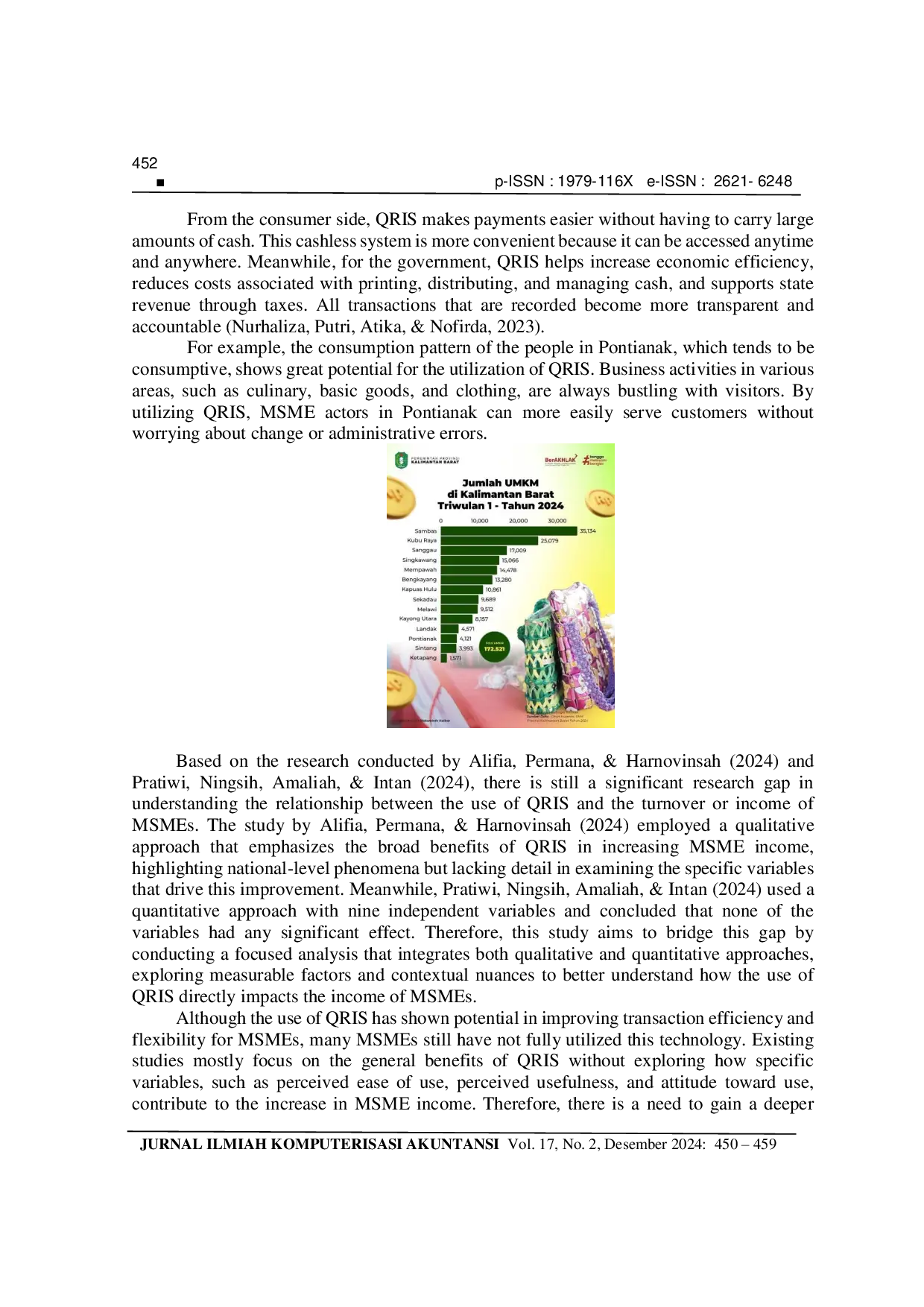 The study demonstrates a significant positive influence of QRIS implementation and user satisfaction on MSME income, validating the principles of the Technology Acceptance Model.While factors like QRIS literacy, convenience, and service price did not exhibit significant individual impacts, they collectively contribute to MSME income.These findings underscore the importance of promoting QRIS adoption and enhancing user experience to maximize its benefits for MSMEs.