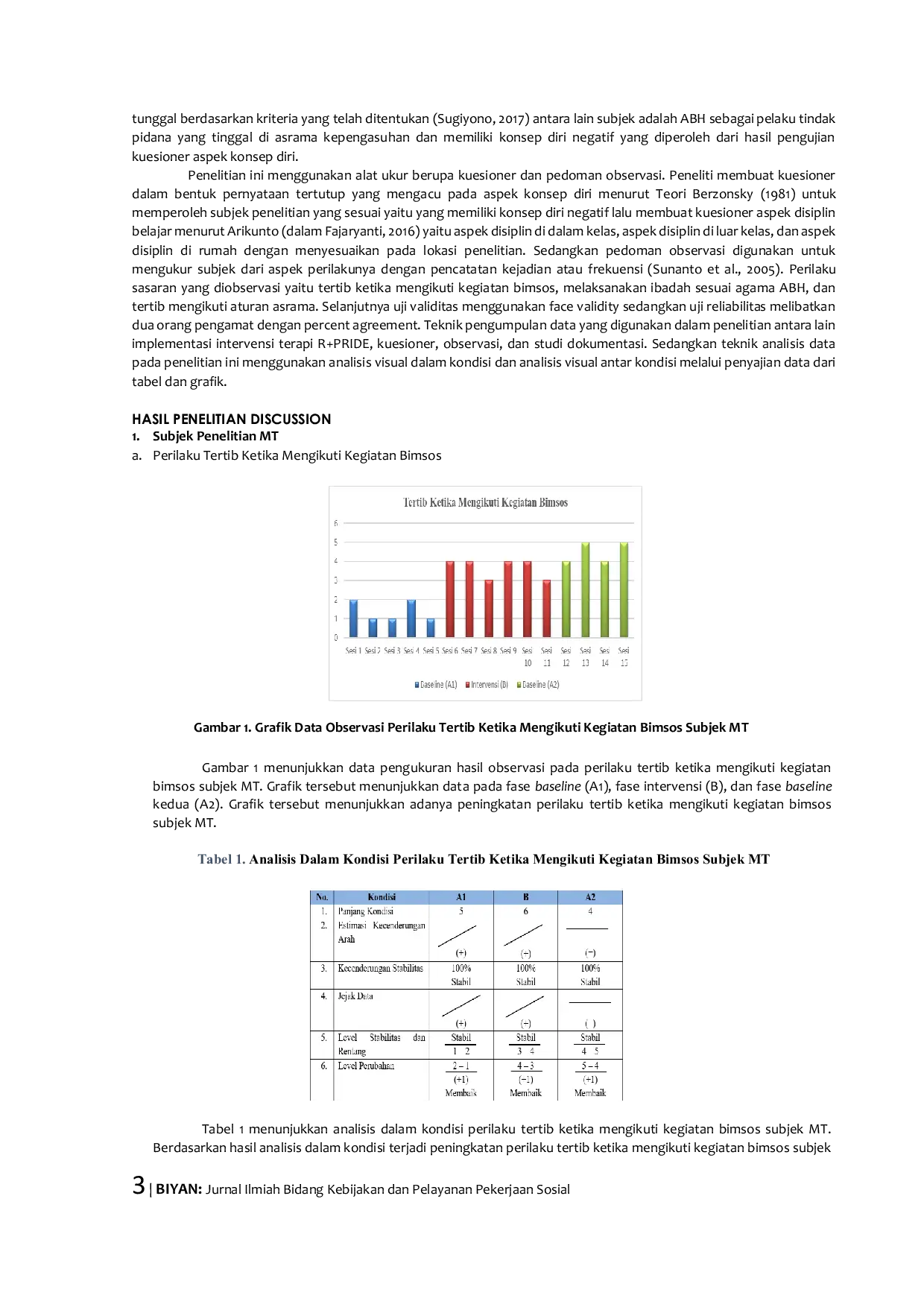 Implementasi terapi R PRIDE merupakan langkah yang tepat untuk menjawab kondisi anak yang mengalami konsep diri negatif yang terlihat dengan rendahnya perilaku disiplin belajar karena terlibat perkara hukum dan menjalani masa rehabilitasi sosial di Lembaga Penyelenggaraan Kesejahteraan Sosial.Hasil implementasi terapi R PRIDE menunjukkan adanya peningkatan skor perilaku disiplin belajar pada saat sebelum diberikan intervensi dengan sesudah diberikan intervensi.Keberhasilan dari implementasi terapi juga didukung dengan hasil analisis dalam kondisi dan antar kondisi yang dilakukan.Secara umum jejak data pada fase intervensi mengalami kenaikan dari fase baseline dengan arah perubahan meningkat positif.
