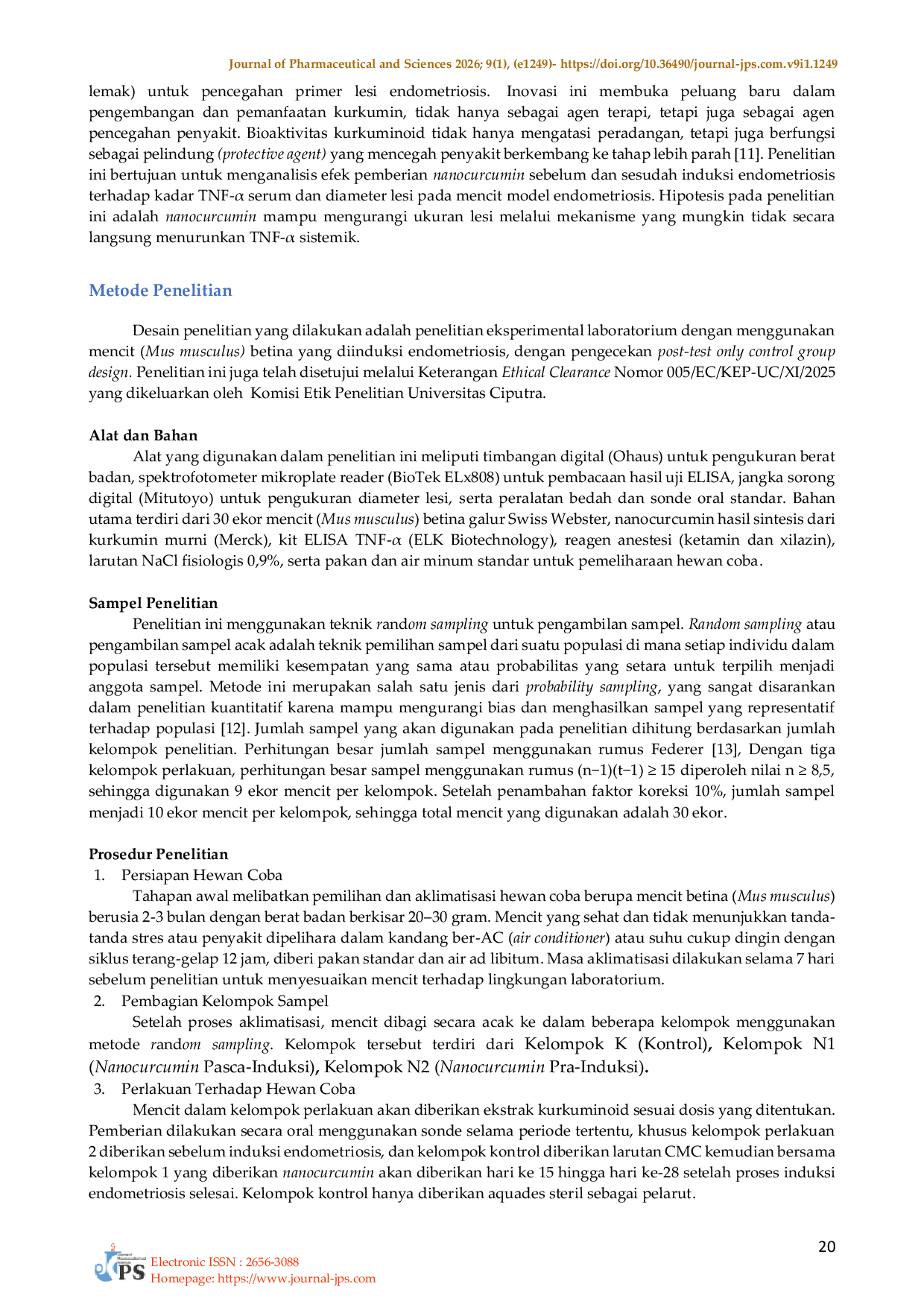 Journal of Pharmaceutical and SciencesJournal of Pharmaceutical and SciencesEndometriosis merupakan penyakit ginekologi kronis yang ditandai oleh pertumbuhan jaringan mirip endometrium di luar uterus, yang memicu inflamasi lokal dan progresi lesi. Proses patologisnya melibatkan peningkatan sitokin proinflamasi, termasuk TNF-α, serta aktivasi jalur proliferatif dan angiogenik. Nanocurcumin, dengan bioavailabilitas yang lebih tinggi dibandingkan kurkumin konvensional, diketahui memiliki potensi modulasi inflamasi dan penghambatan pertumbuhan jaringan ektopik. Penelitian ini bertujuan untuk menganalisis pengaruh nanocurcumin dosis 10 mg/kgBB terhadap ekspresi TNF-α dan diameter lesi endometriosis pada mencit yang diinduksi endometriosis.
