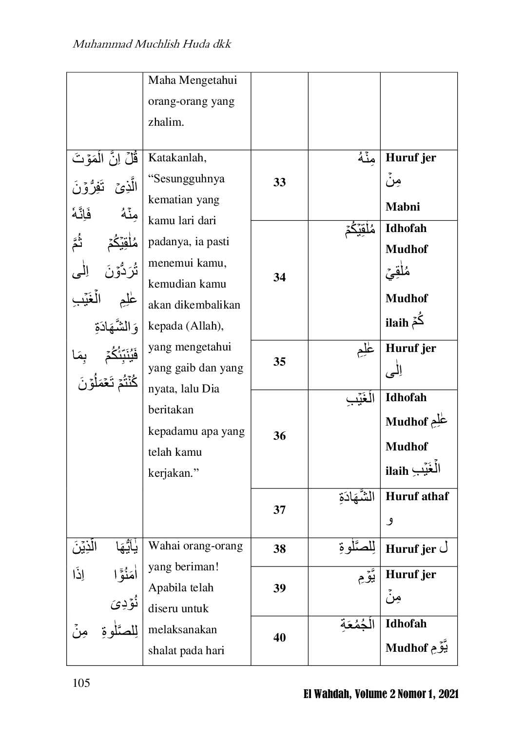 EL WAHDAHEL WAHDAHMajrurat al-asma atau isim-isim yang dibaca jar ada tiga macam, yaitu: dijarkan dengan huruf jar, dijarkan sebab idhofah dan dijarkan sebab tawabi. Penggunaan ketiga majrurat al-Asma tersebut sering mendominasi bentuk atau struktur bahasa Arab, tak terkecuali dalam al-Quran, salah satunya surah Al-Jumuah. Menjadi menarik melihat bagaimana model penggunaan majrurat al-asma dalam surah al-Jumuah ini. Penelitian ini adalah bentuk penelitian sintaksis. Adapun hasil penelitian menunjukkan bahwa isim-isim yang dibaca jar atau majrurat al-asma yang terdapat dalam surah al-Jumuah berada pada 50 tempat dengan perincian, sebanyak 26 tempat dijarkan dengan huruf jar, dan sebanyak 15 tempat dijarkan sebab idhofah. Adapun bentuk majrurat al-Asma dengan dijarkan sebab tawabi terdapat pada 9 tempat.