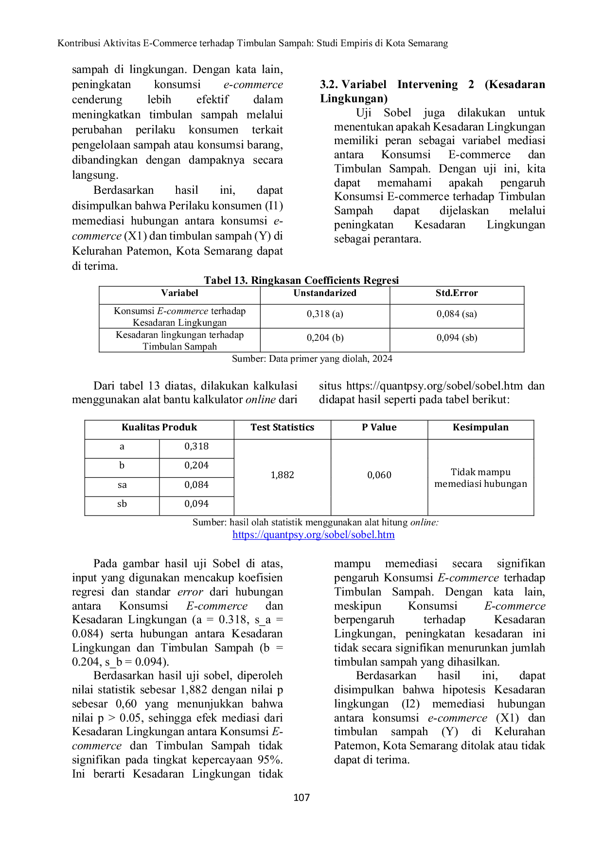 Publikasi Penelitian Terapan dan KebijakanPublikasi Penelitian Terapan dan KebijakanPenelitian ini menganalisis dampak konsumsi e-commerce terhadap timbulan sampah di Kota Semarang, khususnya di Kelurahan Patemon. E-commerce yang semakin dominan pada era industri 4.0 telah mengubah konsumsi masyarakat dan mempengaruhi timbulan sampah rumah tangga. Penelitian ini menggunakan pendekatan kuantitatif melalui survei kepada 100 responden pengguna e-commerce, dan menganalisis hubungan antar variabel menggunakan regresi linear dan uji mediasi Sobel. Penelitian ini mengevaluasi timbulan sampah sebagai variabel terikat (Y), konsumsi e-commerce sebagai variabel bebas (X1), perilaku konsumen (I1) dan kesadaran lingkungan (I2) sebagai variabel intervening. Hasil analisis menunjukkan bahwa konsumsi e-commerce berpengaruh positif terhadap timbulan sampah, sementara perilaku konsumen terbukti memediasi hubungan tersebut. Sebaliknya, kesadaran lingkungan tidak memiliki efek mediasi yang signifikan. Penelitian ini merekomendasikan edukasi konsumsi bertanggung jawab, penguatan fasilitas pengelolaan sampah berbasis komunitas, kampanye anti-pembakaran sampah, insentif daur ulang, serta regulasi kemasan ramah lingkungan pada platform e-commerce untuk mengurangi dampak negatif konsumsi digital terhadap lingkungan.