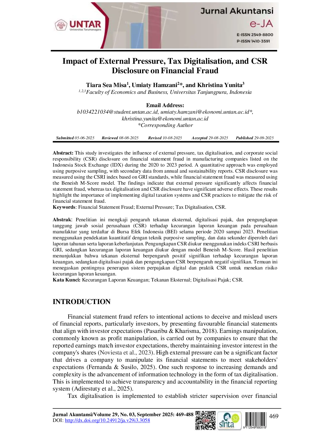 Jurnal AkuntansiJurnal AkuntansiPenelitian ini mengkaji pengaruh tekanan eksternal, digitalisasi pajak, dan pengungkapan tanggung jawab sosial perusahaan (CSR) terhadap kecurangan laporan keuangan pada perusahaan manufaktur yang terdaftar di Bursa Efek Indonesia (BEI) selama periode 2020 sampai 2023. Penelitian menggunakan pendekatan kuantitatif dengan teknik purposive sampling, dan data sekunder diperoleh dari laporan tahunan serta laporan keberlanjutan. Pengungkapan CSR diukur menggunakan indeks CSRI berbasis GRI, sedangkan kecurangan laporan keuangan diukur dengan model Beneish M-Score. Hasil penelitian menunjukkan bahwa tekanan eksternal berpengaruh positif signifikan terhadap kecurangan laporan keuangan, sedangkan digitalisasi pajak dan pengungkapan CSR berpengaruh negatif signifikan. Temuan ini menegaskan pentingnya penerapan sistem perpajakan digital dan praktik CSR untuk menekan risiko kecurangan laporan keuangan.