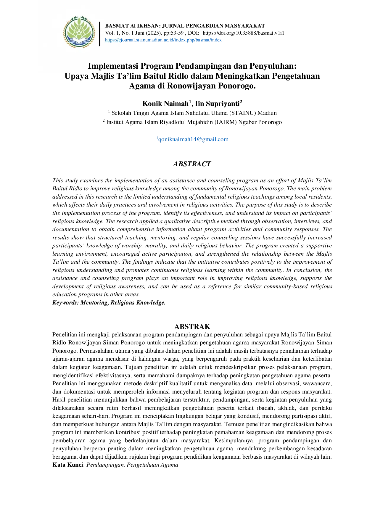 Basmat Al Ikhsan: Jurnal Pengabdian MasyarakatBasmat Al Ikhsan: Jurnal Pengabdian MasyarakatPenelitian ini mengkaji pelaksanaan program pendampingan dan penyuluhan sebagai upaya Majlis Talim Baitul Ridlo Ronowijayan Siman Ponorogo untuk meningkatkan pengetahuan agama masyarakat Ronowijayan Siman Ponorogo. Permasalahan utama yang dibahas dalam penelitian ini adalah masih terbatasnya pemahaman terhadap ajaran-ajaran agama mendasar di kalangan warga, yang berpengaruh pada praktik keseharian dan keterlibatan dalam kegiatan keagamaan. Tujuan penelitian ini adalah untuk mendeskripsikan proses pelaksanaan program, mengidentifikasi efektivitasnya, serta memahami dampaknya terhadap peningkatan pengetahuan agama peserta. Penelitian ini menggunakan metode deskriptif kualitatif untuk menganalisa data, melalui observasi, wawancara, dan dokumentasi untuk memperoleh informasi menyeluruh tentang kegiatan program dan respons masyarakat. Hasil penelitian menunjukkan bahwa pembelajaran terstruktur, pendampingan, serta kegiatan penyuluhan yang dilaksanakan secara rutin berhasil meningkatkan pengetahuan peserta terkait ibadah, akhlak, dan perilaku keagamaan sehari-hari. Program ini menciptakan lingkungan belajar yang kondusif, mendorong partisipasi aktif, dan memperkuat hubungan antara Majlis Talim dengan masyarakat. Temuan penelitian mengindikasikan bahwa program ini memberikan kontribusi positif terhadap peningkatan pemahaman keagamaan dan mendorong proses pembelajaran agama yang berkelanjutan dalam masyarakat. Kesimpulannya, program pendampingan dan penyuluhan berperan penting dalam meningkatkan pengetahuan agama, mendukung perkembangan kesadaran beragama, dan dapat dijadikan rujukan bagi program pendidikan keagamaan berbasis masyarakat di wilayah lain.